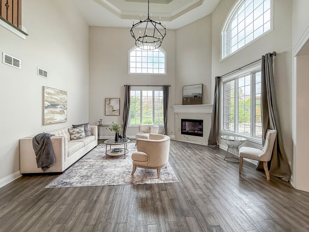 Meet your next luxury home in Frankfort, IL! This stunning property offers 5 full bedrooms and 5 full bathrooms across 3 levels of beautifully finished living space. The grand foyer welcomes you with full hardwood floors throughout. The living room features soaring 25-foot ceilings and a cozy fireplace. The open-concept kitchen includes 42" shaker cabinets, quartz countertops with matching backsplash, and Bosch stainless steel appliances. The first floor offers a formal living room, dining room, den, breakfast area, and an additional bonus room-perfect for guests or a lounge. The second floor showcases new hardwood flooring with 4 spacious bedrooms, including two en-suite rooms. The primary suite features a built-in bar area, a luxurious spa-style bathroom with marble-top vanities, a standalone tub, enclosed toilet, and a generous walk-in closet. The finished basement is designed for entertainment, complete with a wet bar, glass wine room, fitness room, and a stone electric fireplace in the theater area. Step outside to your private oasis featuring a heated in-ground pool with a cascading waterfall, custom stone paver patio, outdoor bar, and a fully enclosed iron fence with brick pillars. A children's playset and a full water sprinkler system installed in the front and back of the home complete this impressive backyard retreat. Better than new construction-this home offers high-end upgrades and thoughtful details throughout. Conveniently located near retail and dining along LaGrange Road and part of the highly rated Frankfort School District 157C and Lincoln-Way East High School District 210.