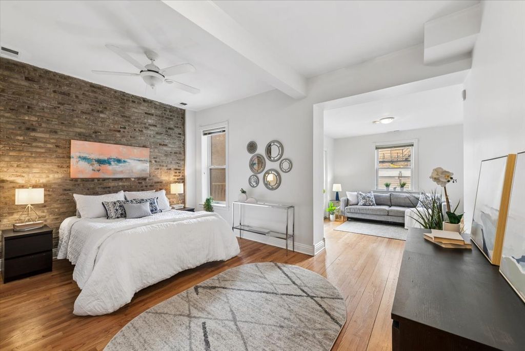 Beautiful vintage 2 bedroom + office, 2 bath home in a well-kept Uptown building on a picturesque tree-lined street. Filled with charm and natural light, this spacious residence features hardwood floors, high ceilings, bay windows, a fireplace, and an expansive living and dining area ideal for everyday living and entertaining. The open kitchen offers ample cabinet space, breakfast bar seating, and great flow into the main living space. Generous primary suite includes exposed brick, excellent closet space, and a separate nook space perfect for a home office, sitting room, or flex area, plus access to a private rear deck. Additional highlights include in-unit laundry, 2 full baths, central air, garage parking with option to install EV Charging, and classic vintage curb appeal. Enjoy a convenient Uptown location near the Uptown Entertainment District, buses, trains, the lakefront, restaurants, and neighborhood amenities, with easy access to nearby Lakeview. Well-maintained building with a solid association.