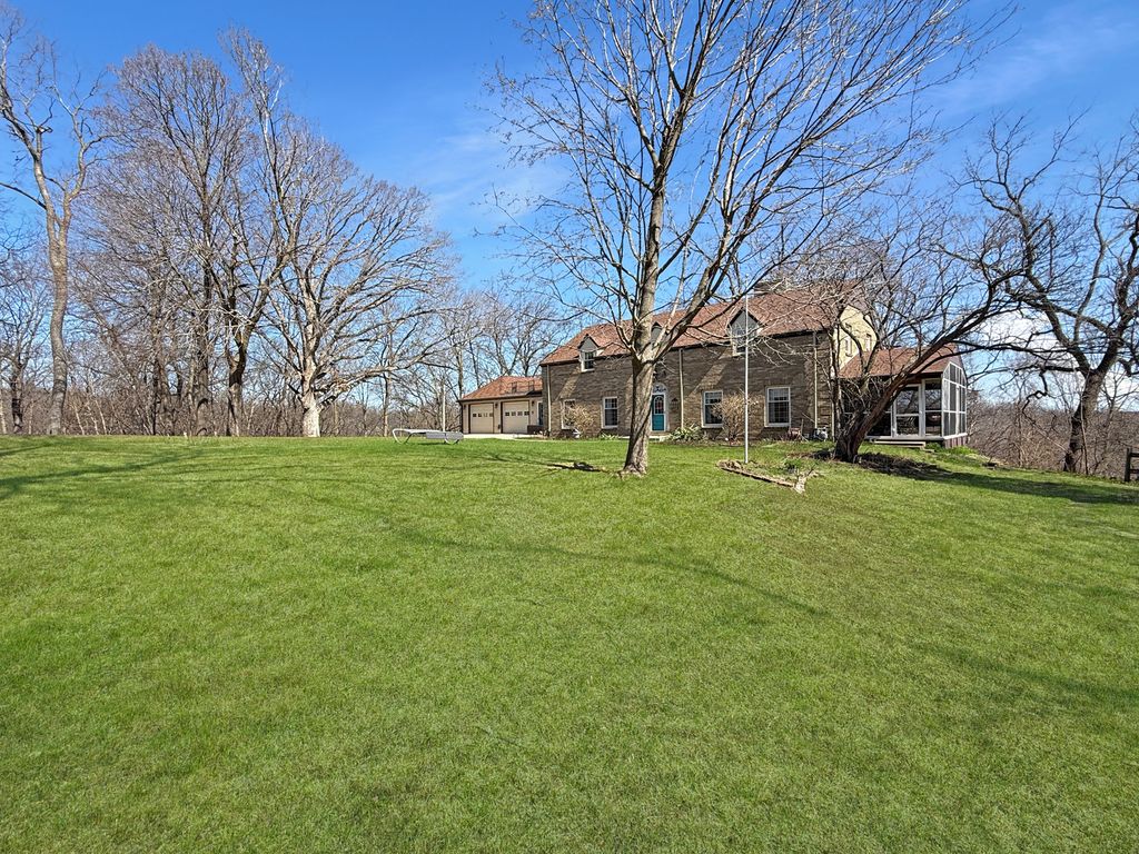 Tucked away on 4.78 wooded acres, this beautiful brick two-story home offers the perfect blend of privacy, space, and modern updates-just minutes from town. Featuring 4 bedrooms, a bonus room, and 3 full baths, the home is designed with both comfort and flexibility in mind. Inside, you'll find hardwood floors and a thoughtfully remodeled kitchen with a granite island, making it truly move-in ready. The inviting living room showcases a woodburning fireplace and flows seamlessly into the dining area. A main-level bedroom, full bath, and a flexible office/den or additional bedroom add versatility to the layout. Upstairs, the spacious primary suite offers a relaxing retreat with a sitting room, whirlpool tub, glass shower, walk-in closet, and abundant storage options. Blackout blinds in the primary bedroom provide added privacy and comfort, while the two additional upstairs bedrooms feature room-darkening shades. Outdoor living is just as impressive with a screened-in porch where you can unwind and take in peaceful wooded views-including a sightline to the iconic Blackhawk statue. A fenced garden with its own water spigot for those who love to garden. The 12x28 heated shop, along with an attached 20x28 garage, provides excellent space for hobbies, storage, or workspace needs. Major updates include new roofs on all buildings in 2023, Furnace 2018, Water Heater 2018, fiber optic internet, gas conversion with connections available for the kitchen, laundry, and fireplaces, additional radiant heat upstairs, and professionally installed permanent exterior lighting. Zoned R2 Residential. This property truly offers the best of country living with modern conveniences and room to grow.
