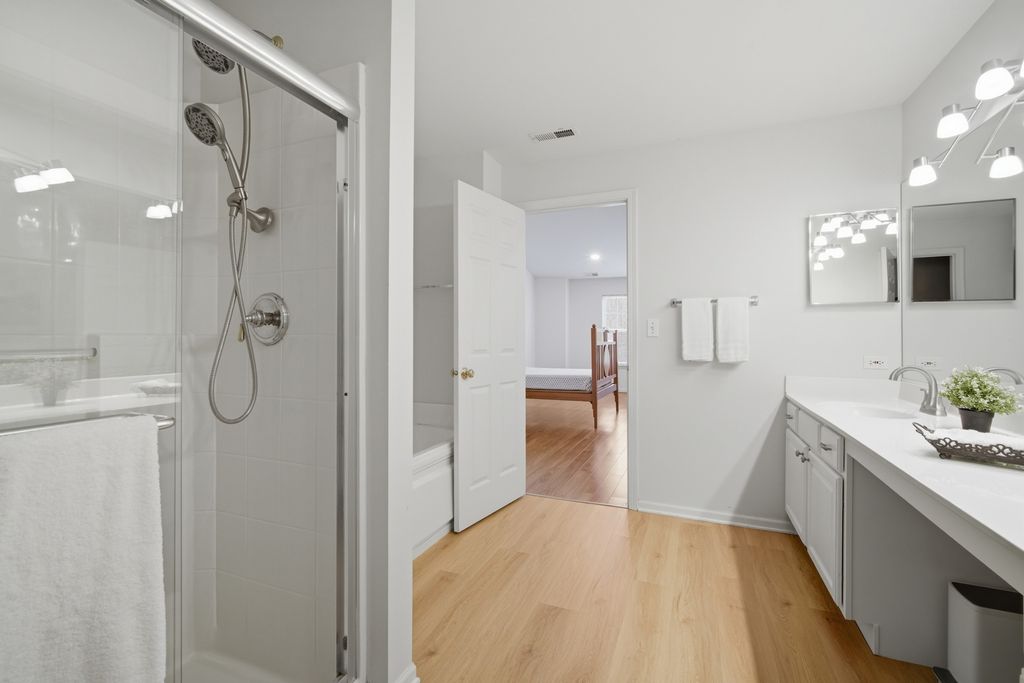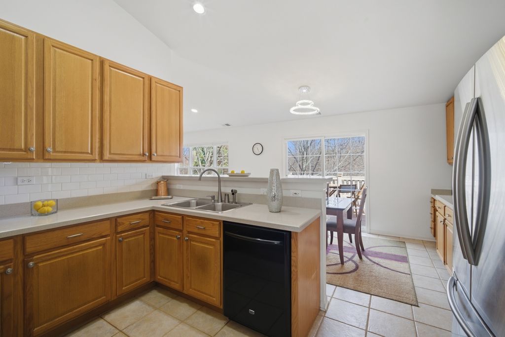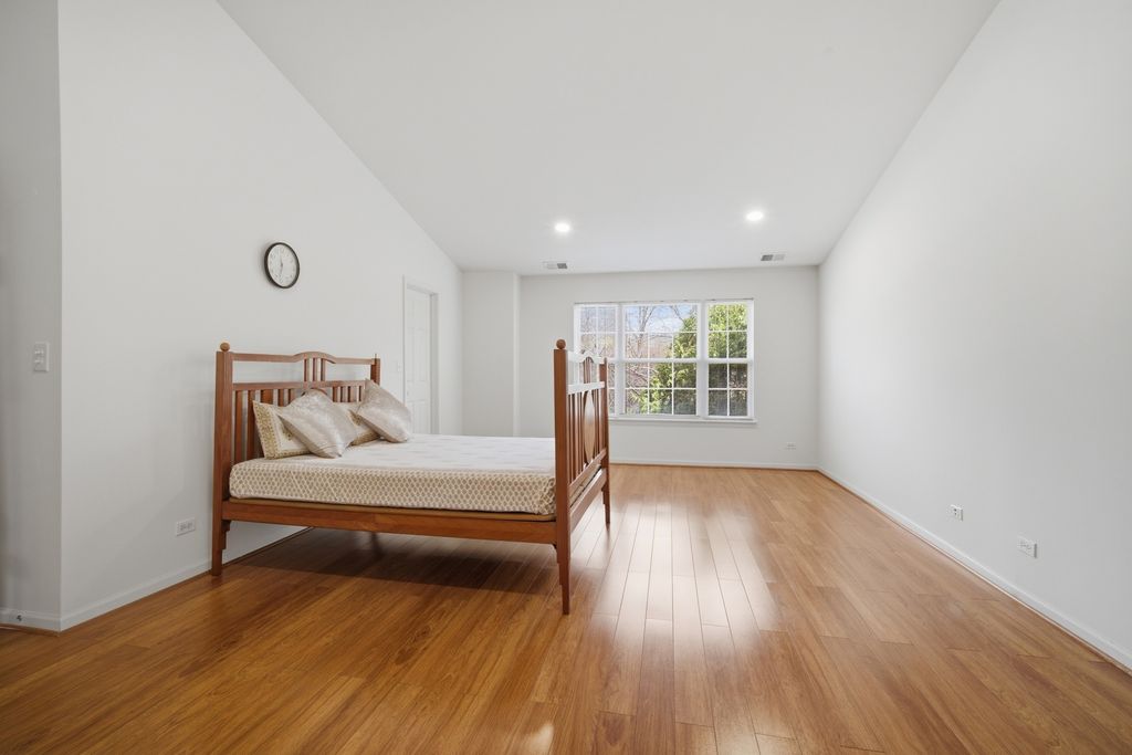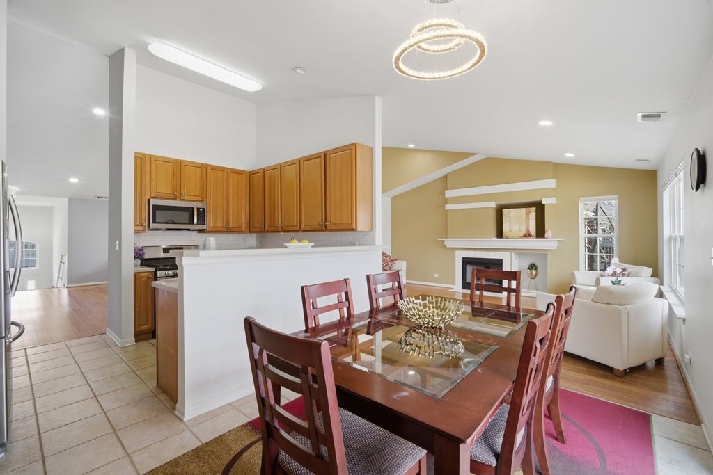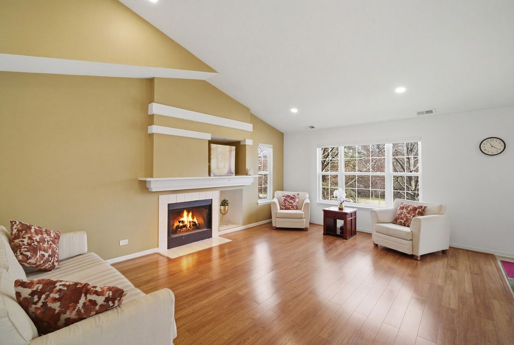 Welcome to this STUNNING 3-bedroom, 2-bathroom townhome in this beautifully landscaped Saddlebrook subdivision of Gregg's Landing in Vernon Hills. From the moment you step into the bright, two-story foyer with a dramatic split staircase, you'll appreciate the ranch-style layout offering convenient single-level living. The expansive open floor plan is filled with natural light and features soaring ceilings, gleaming floors, recessed lights, and white woodwork throughout. Enjoy this enormous vaulted Great Room that seamlessly connects to a warm and inviting Family Room complete with a gas fireplace, built-in shelving, and lots of windows-perfect for relaxing or entertaining. The gourmet eat-in kitchen has lots of cabinets and counter space, stainless steel appliances, a pantry, built-in desk area, and a generous eating space with sliding doors leading to a private balcony deck. Enter through elegant double doors, the grand Primary Suite offers a peaceful retreat with a cathedral ceiling, wall of windows, huge walk-in closet, and a luxurious en-suite bath featuring a soaking tub, separate walk-in shower, dual sinks, and linen storage. Two additional bedrooms with ample closet space along with a full bathroom. A convenient laundry/utility room includes washer and dryer, overhead storage, and utility sink. Enjoy the convenience of an attached 2-car garage with plenty of extra storage, plus guest parking just across the street. Ideally located just minutes from Melody Farms, top-rated restaurants, shopping, entertainment, local parks, libraries, golf courses, transportation, and the Metra. Newer furnace, ac unit, water tank, Ring and door sensors, garage door opener, microwave, carpet, and new light fixtures. This freshly painted home is move-in ready and offers the perfect blend of comfort, style, and convenience. This is a must see and will not last long!