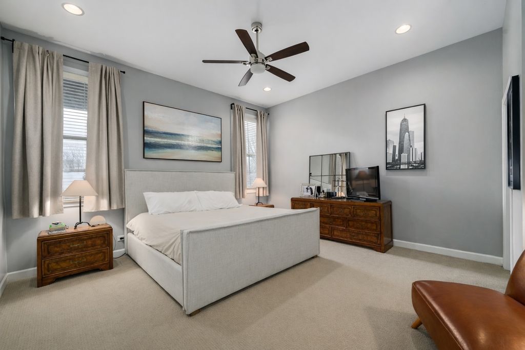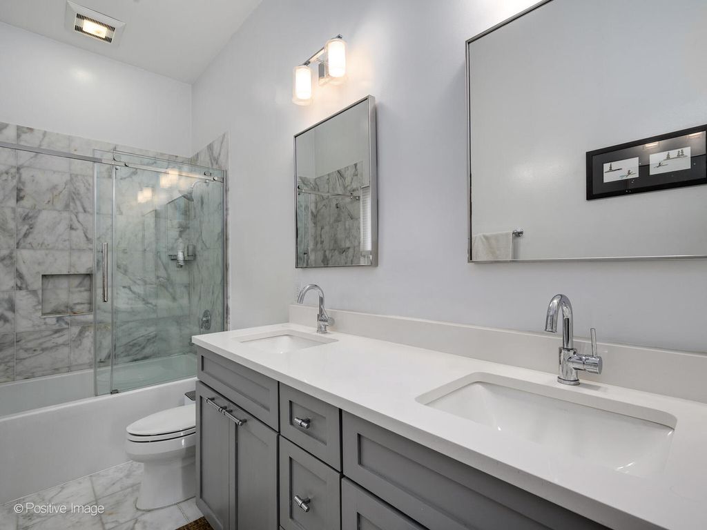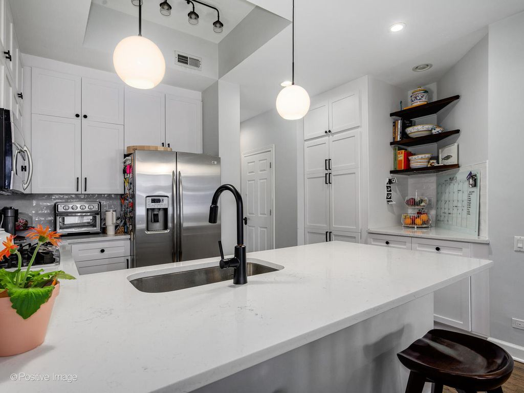 Three-story 2BD/2.5BA residence in Wicker Park's Historic Mansion District on one of the city's most coveted blocks. This 1,850 sq ft home lives like a single-family residence with a private entrance, premium finishes throughout, including soaring 10-foot ceilings on all three levels, gorgeous hardwood floors, two private outdoor terraces, assigned parking in a gated lot, and abundant storage. The main level features an updated chef's kitchen, beautifully appointed with white shaker cabinetry, quartz countertops, stainless steel appliances, peninsula seating, and a dedicated coffee station. The space flows into a dedicated dining area, and an open and bright living room anchored by a stone-front fireplace. Seamless access to a private covered terrace creates an ideal setting for relaxing and entertaining. A refreshed and modern powder room complements and rounds out the main level. The upper level features an oversized primary suite with an expansive bedroom, a walk-in closet, and a comfortable seating area. The en-suite bath features a glass-enclosed marble shower, dual vanity, and bright natural light. A versatile open-concept den provides a ready-made space for a home office, nursery, or reading area, while a second private terrace extends the living space outdoors. The lower level expands the footprint with a second spacious bedroom equipped with large closets and a full bath with stone flooring, a tiled rain shower, and an extra-thick quartz vanity. A second generously sized family room anchors this floor, which features comfortable heated floors throughout. The lower level also includes a large utility area with an in-unit washer/dryer and expansive storage. Additional features of the home include recently installed central air and heat with a Nest thermostat, Yale smart locks, fresh interior paint, and crown molding. All of this is set in an unbeatable location just blocks from the Damen Blue Line, the expressway, and the boutiques, cafes, and restaurants that define Wicker Park.