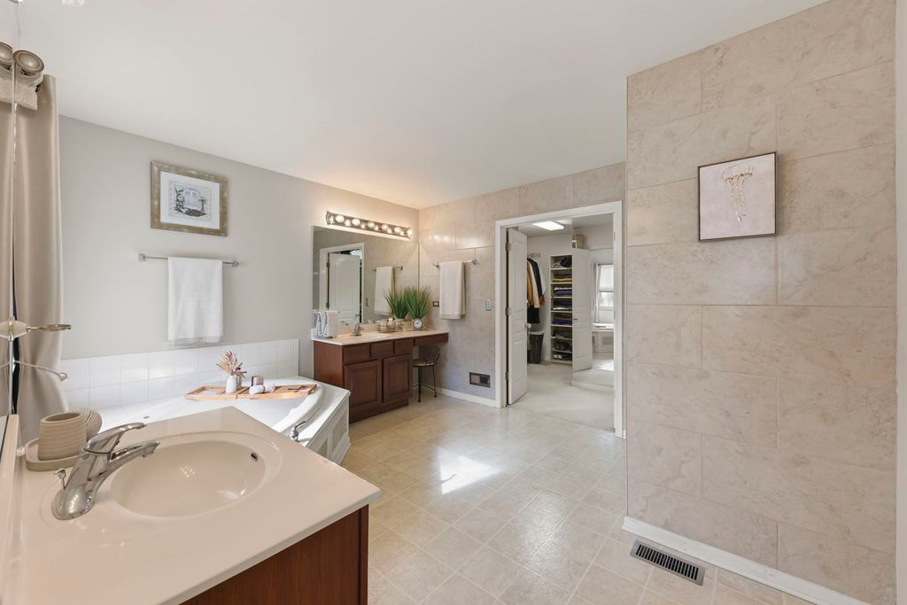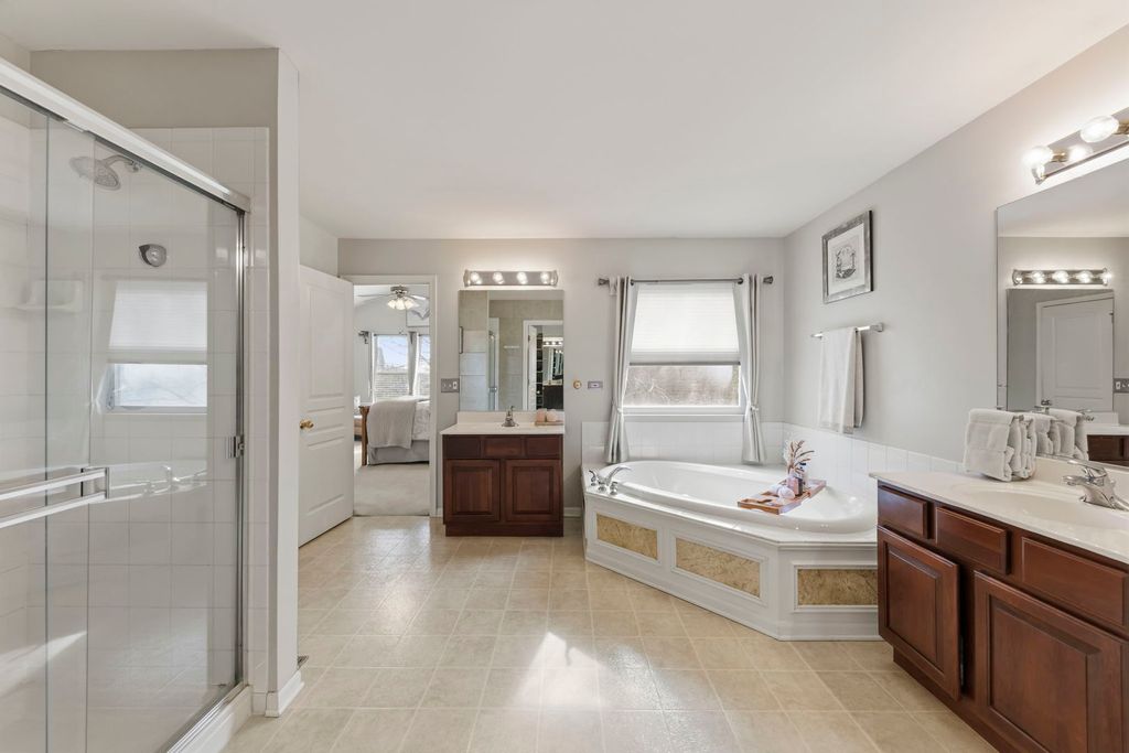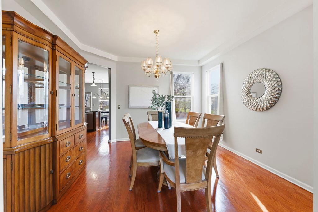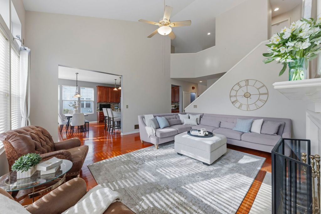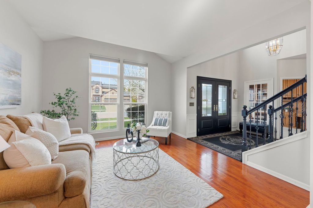 Step through the beautiful double-door entry into a home that immediately feels both impressive and inviting. The front staircase has gorgeous detailed banisters making a bold statement about the quality and incredibly well-cared for home. Thoughtfully designed with an open layout and defined spaces, 13005 Kensington offers a distinctive and coveted floor plan in the neighborhood. To the right of the two story front hall, the formal living and dining room are separated by statement pillars. Both rooms have plenty of natural lighting and are freshly painted in the latest neutral tone, rich hardwood floors and sophisticated millwork adding warmth and refinement throughout. To the left of the front hall, a custom glass paneled door leads to a dedicated office with built-ins and desk, providing the perfect work-from-home retreat. The sun-drenched eat-in kitchen is wrapped in windows-creating a warm, uplifting space for everyday living. Anchored by 42" dark, rich cabinetry, stainless steel appliances, ample granite countertops, pendant lighting, the kitchen flows seamlessly into the main living area with soaring ceilings, located on the southside of the home. Massive windows allow for incredible natural lighting and architectural details to create a sense of airiness and ease. The fireplace mantle and millwork definitely draw the eye. Wait! There is more....The main level is as functional as it is beautiful. A very large first-floor bedroom with vaulted ceilings offers incredible flexibility-ideal for guests, multigenerational living, or could be converted into a private ensuite with the full bath already located on the first floor. One of the home's most suprising features is the BACK staircase! Functionality at its best! Upstairs, four spacious bedrooms await, including a truly expansive primary suite with high ceilings designed for comfort and retreat. The spa-like bath features dual vanities, a soaking tub, separate shower, and a custom walk-in closet that feels more like a dressing room. Upstairs laundry access adds everyday ease. The upper level overlooks both the grand foyer AND main living space, enhancing the home's open, connected feel. The finished basement delivers over 1,800 square feet of additional living space-perfect for entertaining, relaxing, or extended stays-with a full bedroom, full bath, and an abundance of storage complete with built-in shelving. This is more than just a home-it's a space designed to live beautifully, gather effortlessly, and grow into for years to come. Located in Kensington Club, a neighborhood with 248 homes, the community features a pool, a clubhouse, fitness center, playground, soccer fields, and four ponds.