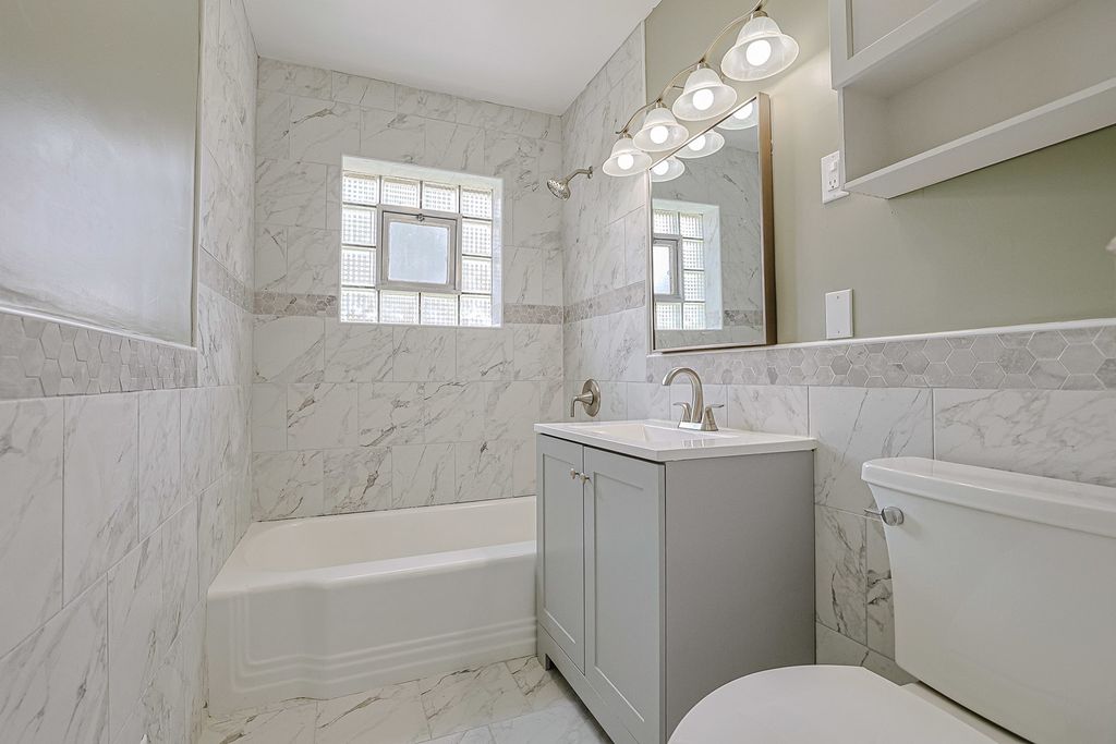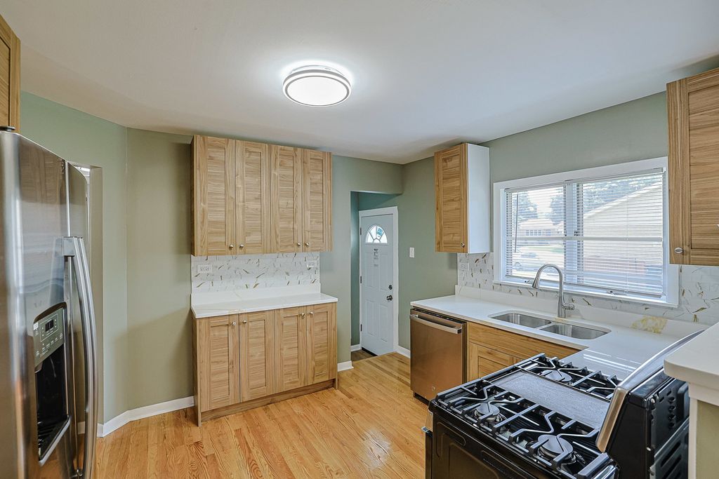 Welcome to this all-brick 3-bed, 2-bath home with modern updates throughout! Kitchen features all brand new stainless steel appliances, granite countertops, and cabinets providing ample space. Refinished hardwood floors on the main level. Main level bathroom has modern finishes, featuring a sleek vanity, stylish tilework, updated fixtures, and lighting for a spa-like feel. Fully finished basement with new flooring, plenty of space for entertaining at your new bar or relaxing with your family. Basement also has plenty of storage space and it's own separate office space. New washer, and dryer in utility room. Attached 2 car garage. Backyard has a lot of space to entertain along with a concrete patio. Located in a quiet, established neighborhood with easy access to shopping, restaurants, hospitals and Melas Park. Move-in ready! Stainless steel appliances (2025) Granite (2025) Cabinets (2025) Bathrooms (2025) Washer Dryer (2025) Soffit/Gutter/Downspouts (2025) Architectural Roof (2025)