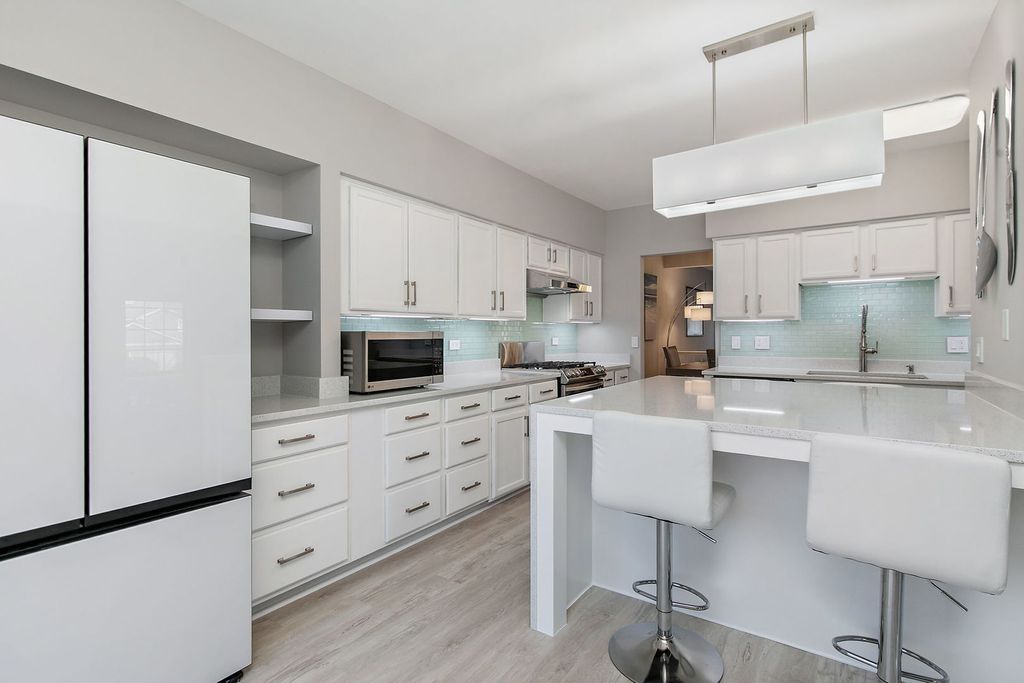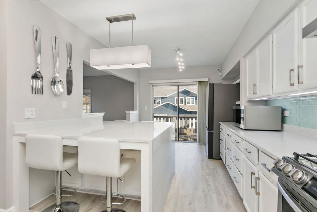 Step inside this exceptional end-unit residence and experience a level of finish rarely found in the community. Largest end-unit in this subdivision! This home has been completely transformed from top to bottom with extensive, high-quality upgrades that create a polished, modern feel throughout. Every surface has been refreshed, including new paint, new carpet, new vinyl plank flooring, new blinds, and new LED lighting with dimmers, delivering a cohesive and elevated look in every room. The fully redesigned kitchen is a true showpiece, featuring sparkling white quartz countertops, an oversized custom island with seating and added storage, a premium Bespoke Samsung appliance suite, heavy-duty stainless HAUSLANE range hood, Kraus sink, Kohler chef's faucet, glass backsplash, under-cabinet lighting with dimmer, soft-close cabinetry, and thoughtfully expanded storage to enhance both function and flow. All bathrooms have been updated with quartz vanities, soft-close cabinetry, coordinated flooring, upgraded LED lighting, and Moen fixtures, offering a clean and contemporary aesthetic. The laundry area is equally refined with a Bespoke Samsung washer and dryer set and a sliding barn door with glass accents. Even the garage has been enhanced with LED panel lighting, and a digital Nest thermostat allows for convenient remote temperature control. The home is prewired for an ADT security system. Beyond the interior, the Parkside HOA has recently completed exterior improvements including new siding, fresh paint, driveway sealcoating, and replacement skylight. The Palatine Trail connects the neighborhood to Birchwood South Park, the Palatine Park District, expansive athletic fields, and scenic walking paths, adding to the appeal of this prime location. With its extensive renovations, upscale finishes, and spacious end-unit setting, this home delivers a truly move-in-ready opportunity that stands out for both quality and design. Highly desirable school district! Pleasant Hill Elementary and Fremd High School!
