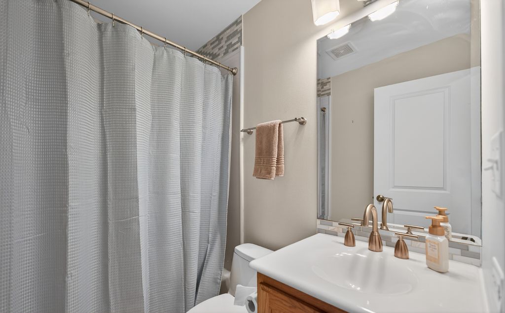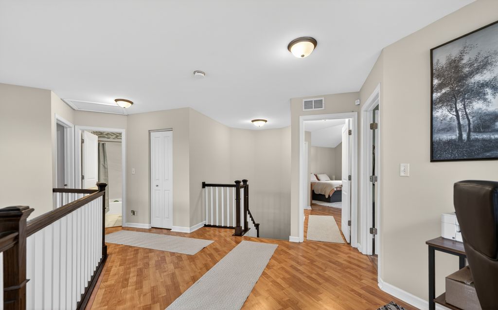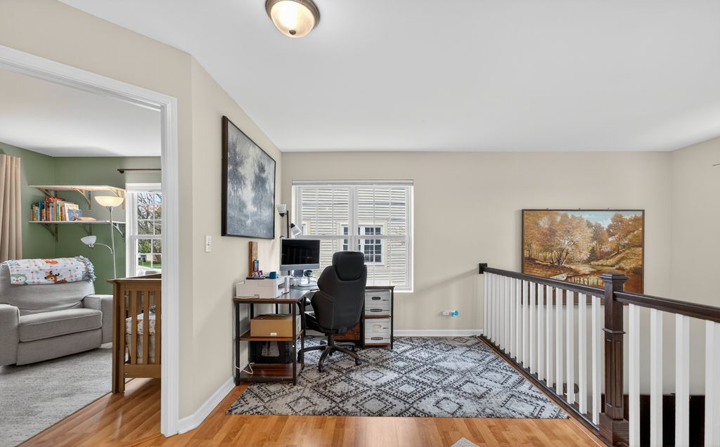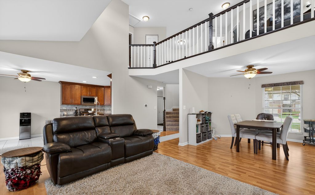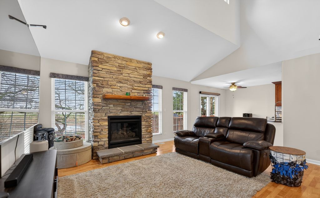 Stunning 3-bedroom, 2.5 bath end-unit residence in the highly sought-after Fox Hollow community, perfectly positioned to back to open green space for exceptional privacy and serene views. This rare and expansive Model E floorplan offers over 2,400 square feet of beautifully finished living space designed for both comfort and sophistication. A charming covered front porch welcomes you into a refined entryway, setting the tone for the impressive interior. The dramatic two-story living room is the heart of the home, showcasing soaring vaulted ceilings, walls of windows that flood the space with natural light, and a striking floor-to-ceiling stone fireplace with a raised hearth and custom wood mantel, creating a warm yet elevated focal point. The thoughtfully designed kitchen blends style and function, featuring slow close custom rich maple cabinetry, stainless-steel appliances, brushed nickel hardware, and a spacious breakfast bar ideal for casual dining or entertaining. The adjoining eating area opens to a private deck overlooking peaceful green space, offering the perfect backdrop for morning coffee or evening gatherings. The main level is enhanced by durable wood laminate flooring throughout, providing both beauty and ease of maintenance. Upstairs, a spacious open loft overlooks the main living area, offering a versatile space ideal for a home office, lounge, or additional living area. The upper-level hosts three well-appointed bedrooms, including an expansive primary suite designed as a true retreat. Featuring vaulted ceilings, abundant natural light, and wood laminate flooring, the master suite also boasts a large, walk-in closet with built in organization, and a spa-inspired ensuite bath complete with dual vanities, a jetted soaking tub, and a separate walk-in shower. The finished basement offers an impressive extension of living space, ideal for entertaining or relaxing, with custom wood-paneled accent walls, plush carpeting, and a thoughtfully designed layout. Ample storage, built-in shelving, and a dedicated utility and laundry area add exceptional functionality. Additional highlights include a finished 2-car garage with built-in storage, well-proportioned secondary bedrooms, and an abundance of windows throughout the home that enhance both light and views. This exceptional end-unit residence seamlessly blends space, design, and location, offering a truly elevated living experience.