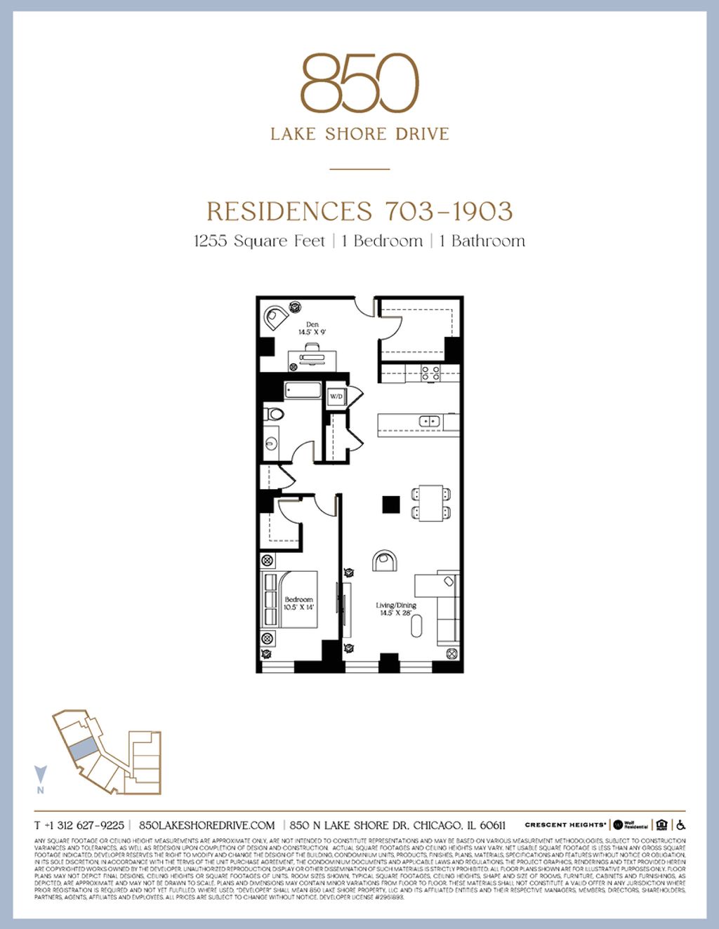 Now over 55% closed and ready for immediate occupancy! One-, two-, and three-bedroom units available ranging from 1000-3700+ square feet. 1203 is a 1255 sq ft one bedroom with large den which has lake facing views from every window, 9' ceilings, walk-in-closets and all new SS Bosch kitchen appliances and new, in-unit Whirlpool washer and dryer. 850 Lake Shore Drive, awarded Development of the Year, is a fully amenitized, beautifully renovated historic building along Chicago's lakefront that blends timeless architecture with modern luxury. The grand lobby sets the tone with soaring ceilings, elegant chandeliers, and refined architectural details throughout. Residents enjoy exceptional amenities, including a heated indoor pool, hot tub, fully equipped fitness center, a 3,500-square-foot Grand Lounge with 20-foot ceilings and lake views, and a rooftop deck overlooking Lake Michigan. Perfectly located between Michigan Avenue and Lake Shore Drive, the building offers effortless access to world-class dining, shopping, culture, and the lakefront trail-everything you desire is at your front door. Garage parking is available on site. Preferred lender financing incentives are available for a limited time! **Photos and Virtual Tour are of the model residence. These are representative of inventory available or optional finish upgrades and may not exactly represent this listing unit. The design choices represented in the renderings are proposed options reflecting general design inspiration and considerations. All design intent is subject to change. A variety of floorplans are available.**