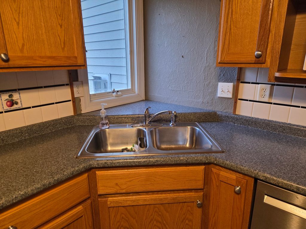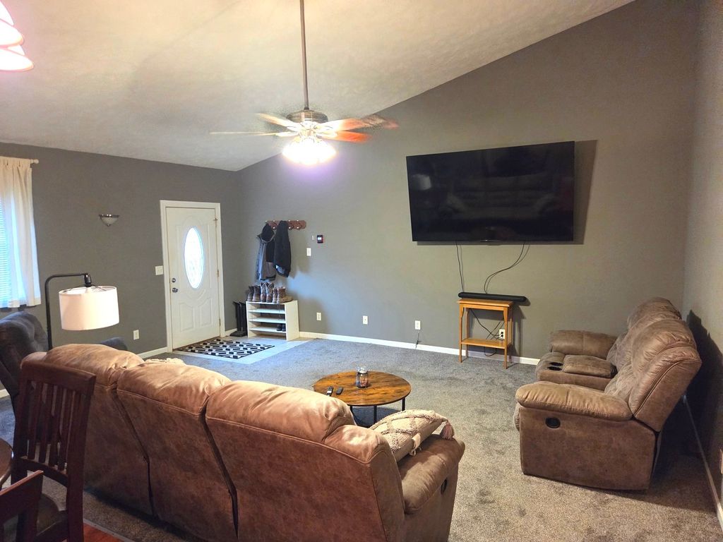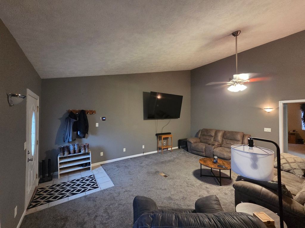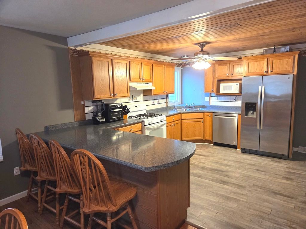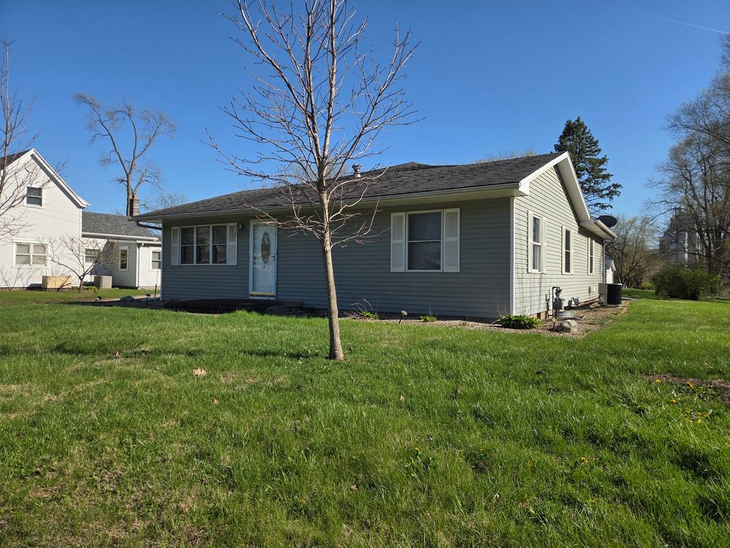 Spacious 3-bedroom, 2-bath ranch offering nearly 1,850 square feet of comfortable living space. The large eat-in kitchen features abundant cabinetry and a breakfast bar complete with solid oak bar stools-perfect for casual dining or entertaining. The open dining and living room combo (13x21) showcases beautiful hardwood floors, creating a warm and inviting atmosphere. The sunken family room is a standout feature, boasting a vaulted ceiling and a cozy corner fireplace-an ideal space for relaxing or hosting guests. The primary suite also features a vaulted ceiling, along with a private bath that includes a double vanity, walk-in closet, and additional storage area. Additional highlights include an oversized 2-car garage, a storage shed, and a generous 0.28-acre lot. The home addition was completed in 2002, at which time all windows were replaced. Recent updates include new electrical service (2025) and a new water heater (2024). A private drive plus convenient alley access add to the home's functionality.