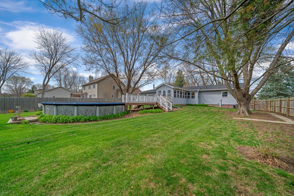 Spacious ranch home offering far more living space than meets the eye! This well-designed split floor plan features 4 main-level bedrooms, with 3 bedrooms on one side of the home and a private primary suite on the opposite side, complete with a generous bedroom, whirlpool tub, and adjoining family room with fireplace-perfect for a private retreat. The heart of the home boasts a huge kitchen with ceramic flooring, along with hardwood floors throughout much of the main level. A bright 3-season room provides additional space to relax and enjoy views of the beautifully maintained yard. The fully finished basement expands your living space even further, offering a spacious living area plus 2 additional finished rooms-ideal for offices, guest rooms, or hobby spaces-along with a total of 3 full bathrooms throughout the home. Step outside to a fenced backyard featuring composite decking and an above-ground pool, perfect for entertaining. The property also includes an impressive 35x25 garage-nearly 4-car capacity, providing ample space for vehicles, storage, or a workshop. With generous room sizes, multiple living areas, and a flexible layout, this home offers exceptional space and functionality in a desirable ranch-style design.