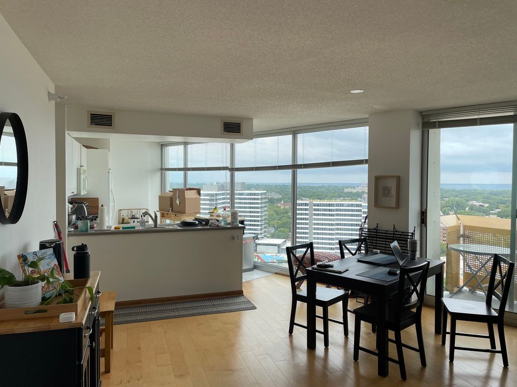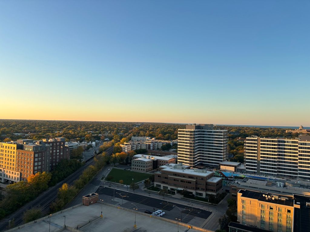 Georgeous lake and city views from the 21st floor of this condo with huge ceiling to floor windows. Spacious open kitchen / great room with lovely balcony. New Maple Floors. Side by side washer and dryer. Two spacious bedrooms and 2 lovely huge baths.Extra storage area included. Great location in downtown Evanston near lake, train, theatre, and more! The view will take your breath away!!! Don't miss this one!!! Building has installed capability of installing an electric charger in all parking spaces.