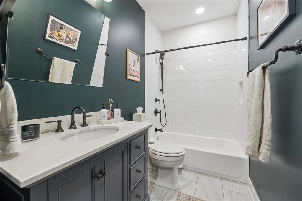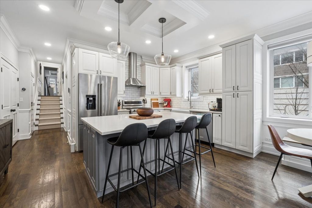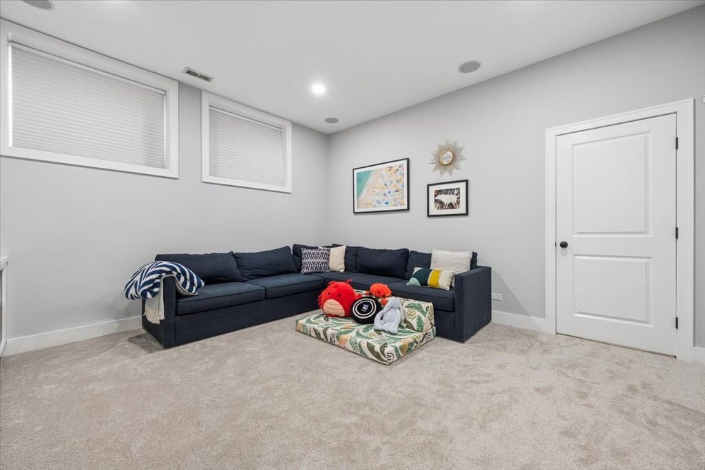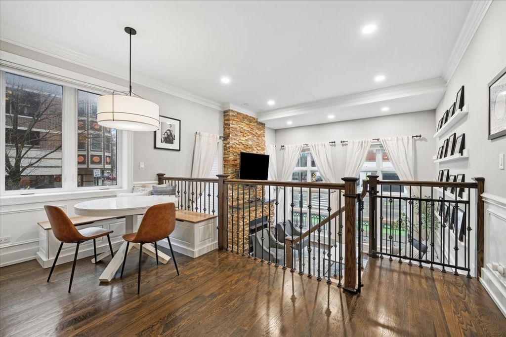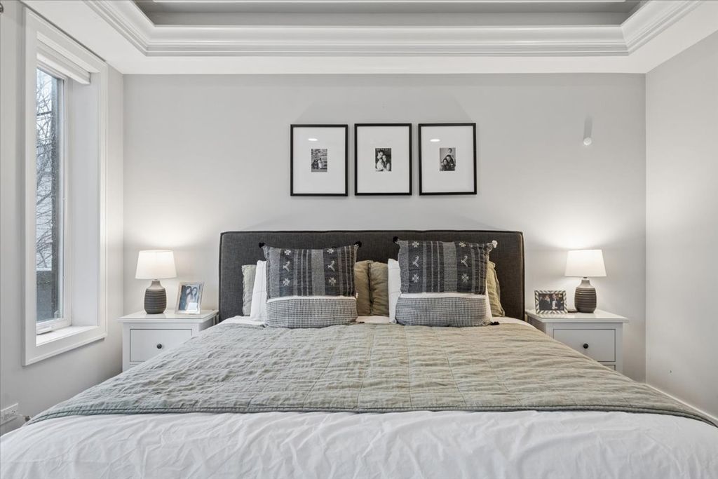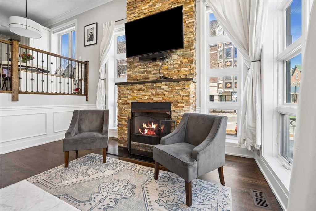 Exceptional 4BD/3BA duplex-down in the heart of Roscoe Village, offering garage parking and a beautifully designed private roof deck. This light-filled home features soaring ceilings, hardwood floors, elegant crown molding, and a dramatic wall of windows anchored by a stone fireplace. The kitchen showcases quartz countertops, a spacious island, custom backsplash, and premium stainless steel appliances with room for dining. The primary suite offers custom closets and a spa-caliber bath with marble finishes, and dual vanity. Two additional bedrooms and a full bath complete the main level. The lower level is ideal for entertaining, with a generous recreation room, fourth bedroom or office, and a third full bath. Refined upgrades throughout include custom millwork, built-ins, great lighting, motorized blinds, heated bathroom floors, surround sound wiring, and smart home integration. The private roof deck has been fully rebuilt with pergolas, lighting, and fans...perfect for elevated outdoor living. Premier Roscoe Village location just steps from Hamlin Park and Fellger Playlot. Enjoy easy access to boutique shopping, charming cafes, and sought-after dining along Belmont and Roscoe.