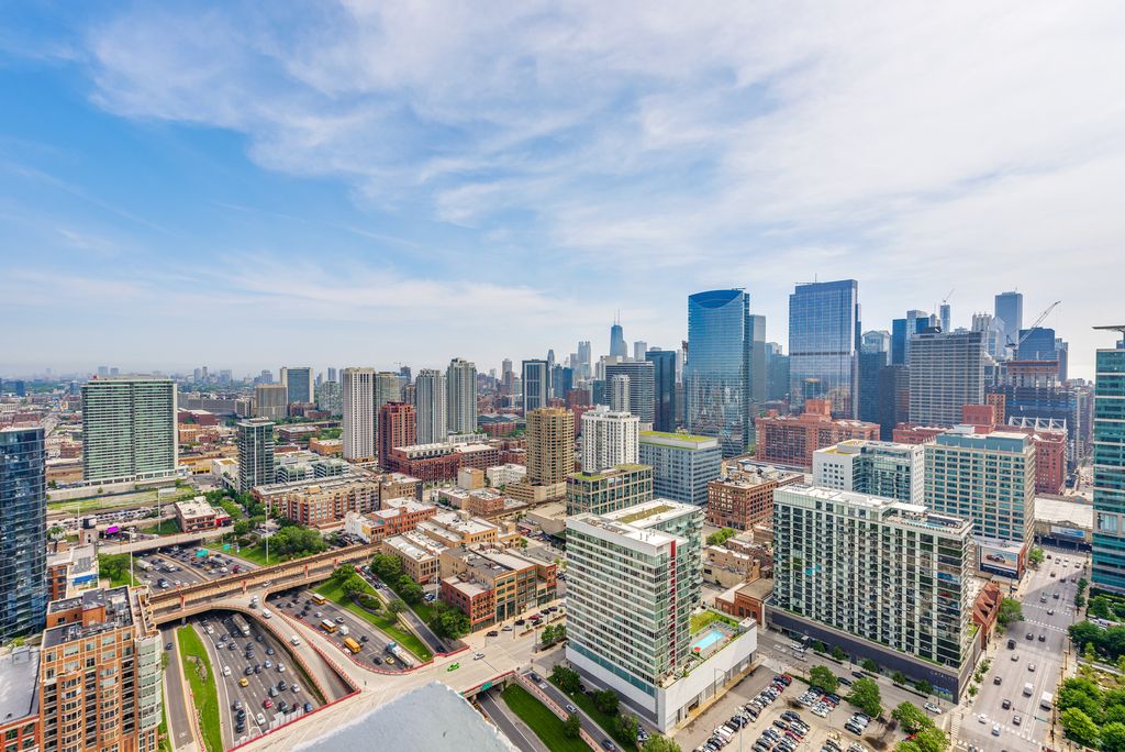 Stunning city views from this high-floor unit at Skybridge. Approximately 1800 square feet and only 1 of 2 units on the 36th floor, this oversized 2Bedroom/2Bathroom floorplan features floor-to-ceiling windows with southwest exposure providing tons of natural light. Other features included hardwood flooring, large living room with designated dining area, massive primary bedroom with on-suite bathroom & walk-in closet, laundry room with side-by-side laundry, and balcony. Modern kitchen with dark stained maple cabinetry, stainless steel appliance package, large island, and granite countertops. The primary bathroom features 6-foot soaking tub, separate shower, and double vanity. Prime deeded garage parking space located on the 1st floor available for 30K. The building was constructed in 2004 and is comprised of 237 residential units. Enjoy 24/7 door staff, exercise room, sundeck with city views, individual storage, dog run, and on-site property management. Direct access to Whole Foods downstairs, and easy walk to Randolph St, Fulton Market, public transportation and everything the West Loop has to offer. Special assessment paid in full by seller so new owner does not have to assume any cost.