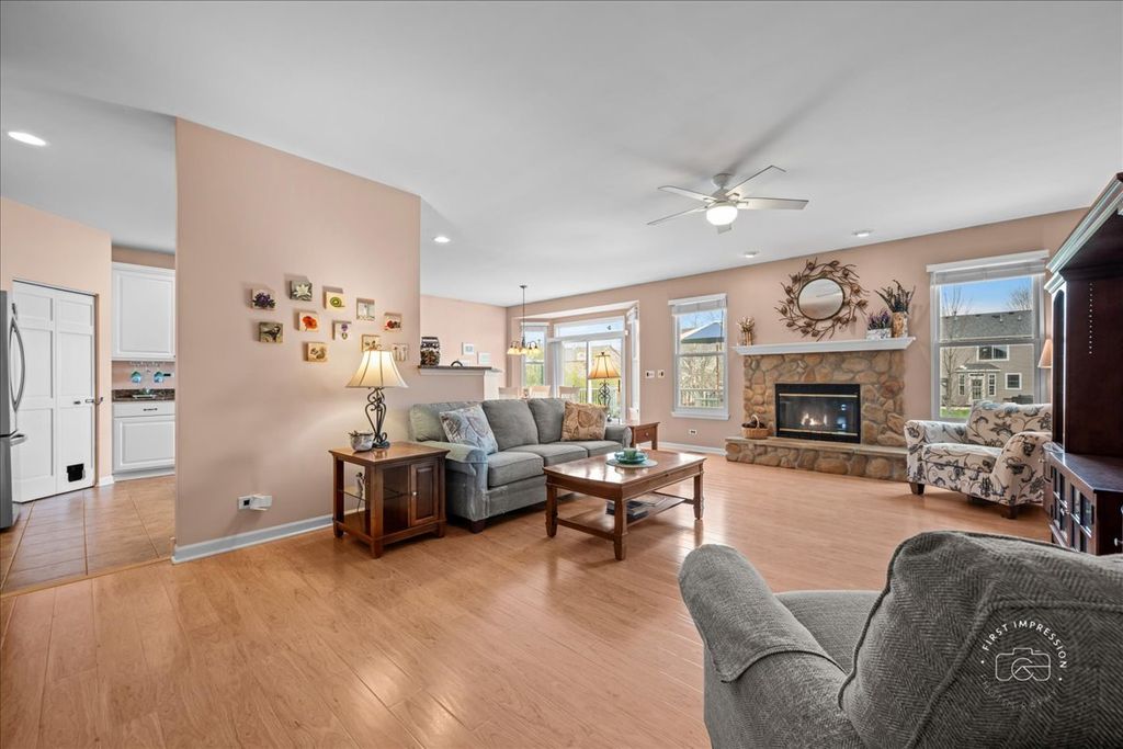 Beautiful and Clean RANCH in popular Tanner Trails is ready for you! From the moment you step into the spacious foyer, you'll appreciate the open floor plan and fresh, inviting feel throughout. This floorplan is wonderful and rare! Three bedrooms AND an office! The large formal dining room is a great place to welcome guests, and the nearby office offers the perfect space for working from home. The great room showcases upgraded luxury wood laminate (Pergo Outlast) flooring (2018) and a beautiful stone fireplace with gas logs and gas start, seamlessly connecting to the fully updated kitchen (2019) with quartz countertops, white cabinetry with pull-outs, and a pantry closet. An eating area with sliding glass doors leads to the deck, making indoor-outdoor living easy. Tucked toward the back of the home are three generously sized bedrooms, including a primary suite with a full bath and a walk-in closet with built-in organizers. The second full bathroom was beautifully updated in 2024. The home also features a full English basement with windows, a deep pour for extra ceiling height, and a bath rough-in. If you finish it, there are endless possibilities for additional living space. Outside, enjoy a recently updated deck (2024), a new lower patio (2024), and professionally landscaped grounds within a fully fenced yard (2021). Major updates include a new roof (2023) and (Anderson) windows (2024). Tanner Trails is a lovely place to live, with walking paths, a large pond, and open green space, this home is just minutes from I-88, shopping, and dining. Don't miss this opportunity!