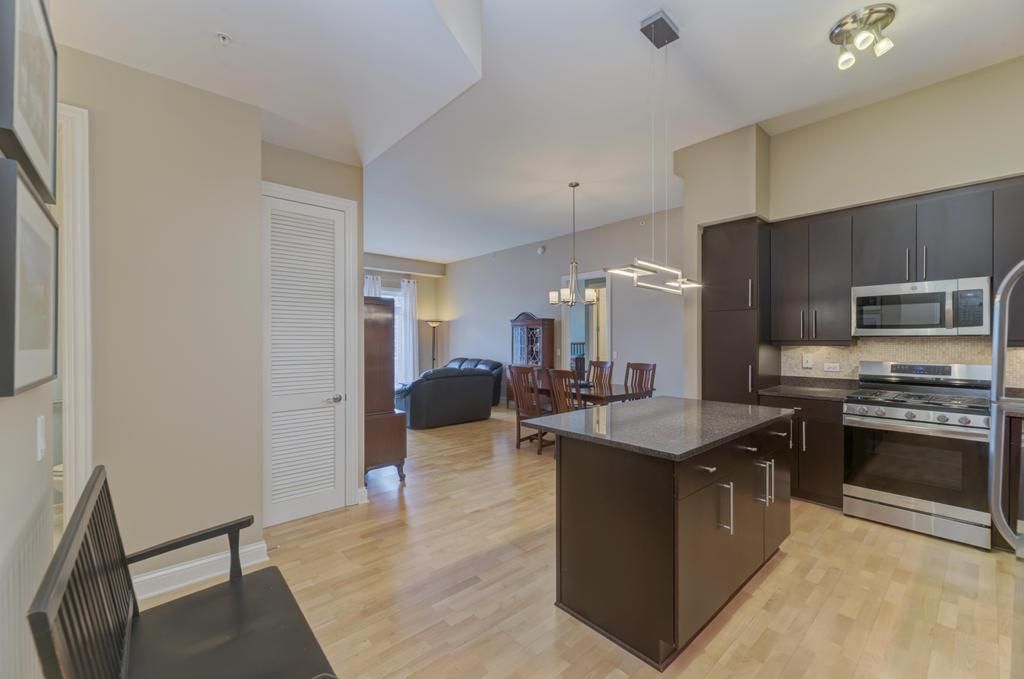 Light-filled and spacious loft-like 2-bedroom, 2-bath condo in the highly sought-after Waterford Condominiums! This beautifully updated unit features soaring 10.5-foot ceilings, 8-foot doorways, and stunning light beech wood flooring throughout, creating an open and airy feel. The updated island kitchen is perfect for entertaining and showcases 42" Cherry Mocha cabinetry, granite countertops, Italian marble mosaic backsplash, and upgraded stainless steel appliances. Additional upgrades include modern light fixtures, Moen faucets, Kohler toilets, and designer Benjamin Moore paint colors throughout. Enjoy natural light pouring in through oversized windows with 2-foot glass transoms and sliding glass doors leading to the balcony. The spacious primary suite features a huge upgraded bath with granite counters and added safety features including grab bars. This well-maintained building offers security cameras, WiFi in common areas, and the convenience of 1 ground level parking space. Ideally located in downtown Des Plaines-just minutes to restaurants, shopping, theater, schools, and expressway access. Move-in ready with style, space, and an unbeatable location!