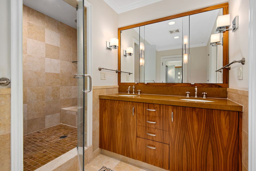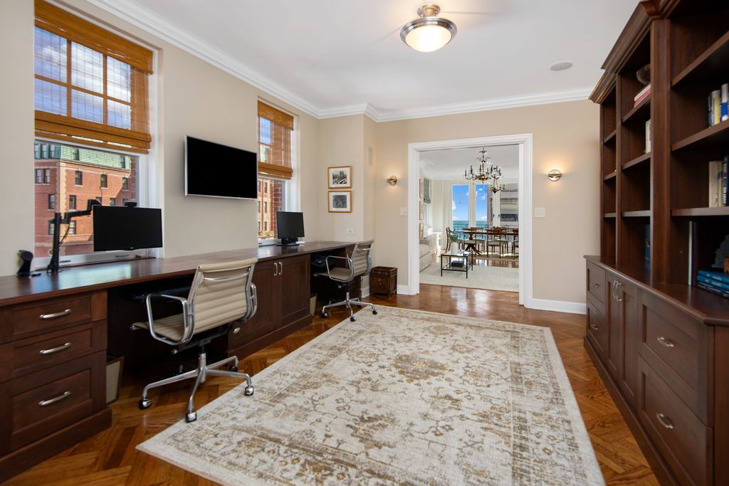 Magnificent, expansive residence that lives like a single-family home on one level with stunning Lake Michigan views. Delivering over 4,500 square feet across 4-bedrooms, 4.1 baths, plus a dedicated home office and additional den, you'll appreciate the privacy and convenience of the elevator opening directly into your foyer, leading to the sprawling home's open floor plan, accented with arched entryways providing a distinctive blend of historic charm and modern living. Flooded with natural light, the focal point of the home is the living room / dining room view, framing the lake's scenic harbor dotted with sailboats, an ideal space for large family gatherings or quiet nights at home. No convenience was overlooked during the renovation, from the chef's kitchen outfitted with professional-grade appliances, custom cabinetry, pantry storage, stone countertops, and expansive cityscape views from the charming windows above the sink, open to the great room complete with bespoke millwork and built-ins. A substantial primary suite features two walk-in closets, bathroom with private water closet, dual vanity sinks, and linen storage. Three sizable secondary bedrooms, two en-suite, fourth full shared-bath, plus substantial storage throughout all rooms and common areas. Full-size laundry room teeming with organized storage, bonus space ideal for peloton/exercise, completes the home. The Eddystone offers a range of services and amenities to enhance your living experience, including 24-hour door person, full-time engineer, on-site building manager, fitness center, and recently updated roof deck complete with grills for outdoor gatherings. Two large storage lockers included, garage parking readily available half block away.