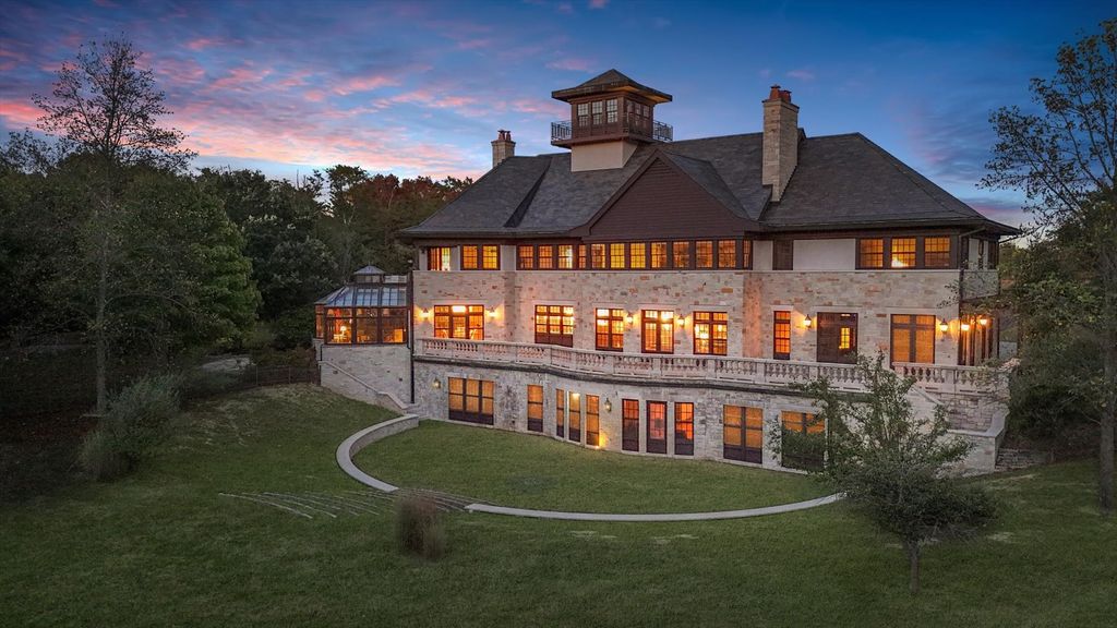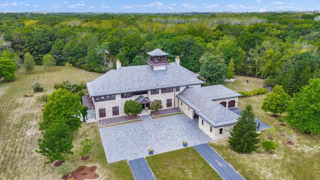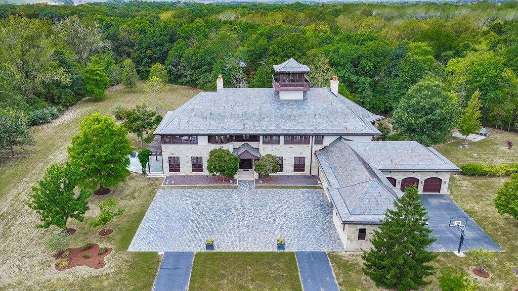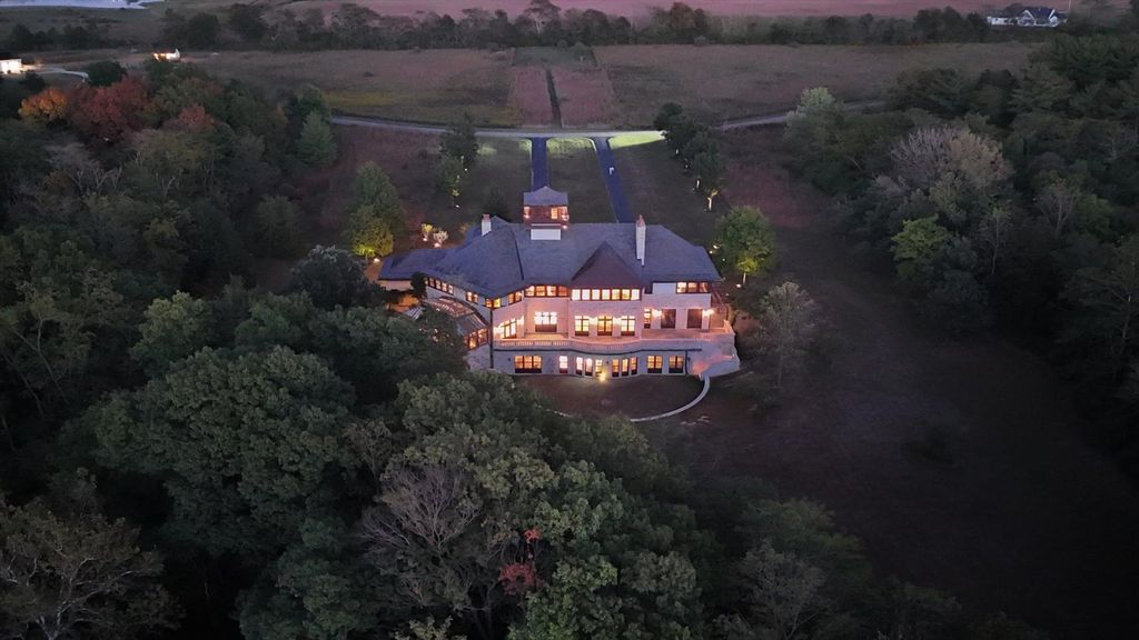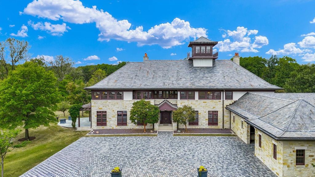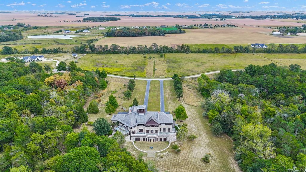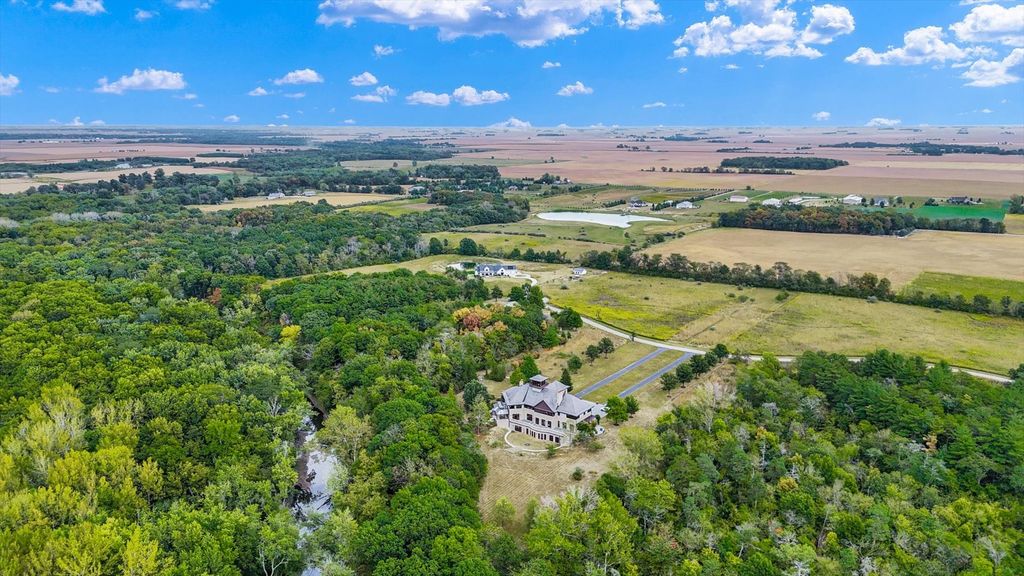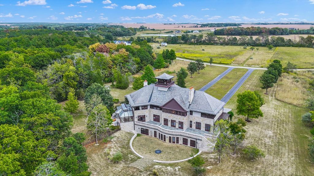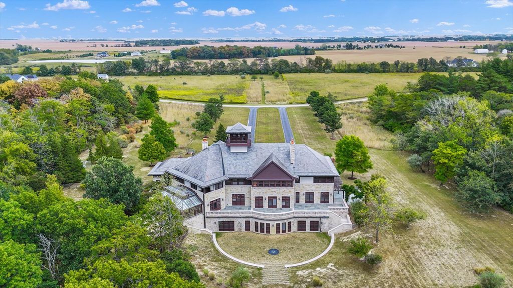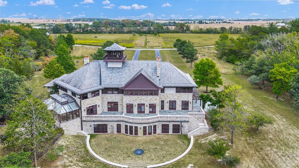 Introducing The Hidden River Estate, a generational estate of timeless craftsmanship and enduring design. Inspired by classic English country manors and enhanced by Frank Lloyd Wright architectural principles, this extraordinary residence rests on just under 26 private acres north of Mahomet, with frontage along the Sangamon River and adjacency to the Heron View Forest Preserve. Constructed of quarry stone, limestone, slate, and copper, every material was chosen for permanence and integrity. Inside, natural finishes of marble, granite, Jerusalem stone, and solid hardwoods pair with intricate millwork and custom-built furnishings. The home spans over 18,000 square feet across multiple levels, each connected by an elevator and designed for both elegance and function. The main level centers around a soaring Great Room framed by stone and light, flowing into the chef's kitchen equipped with SubZero, Thermador, and Miele appliances. A handcrafted English conservatory, imported from England, serves as a year-round retreat with panoramic woodland views. Each bedroom features a private en suite bath, while the primary suite offers dual walk-in closets, a spa-inspired bath, and balcony access. The tower observatory, accessed by 54 steps, reveals 360 treetop and river views. Every element of the property was engineered to commercial-grade standards, including redundant systems, geothermal HVAC, multiple wells, lift pumps, a full-house generator, and professional-grade service access throughout. The lower level includes a fitness area, sauna, with abundant storage and flex space. Outdoor amenities include five-car garage capacity, a slate roof, and multiple balconies overlooking manicured lawns and mature trees. Hidden River represents the rare combination of enduring construction, thoughtful design, and natural beauty, a timeless, generational home built to last for centuries.