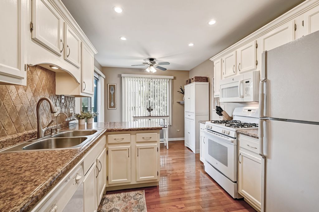 Gorgeous 2nd-floor condo, impeccably cared for with white cabinetry in the kitchen, hardwood floors throughout the living areas and 2nd bedroom, a separate dining room, and room for a breakfast table in the kitchen. Two sliding doors to a generously sized patio from the living room with a fireplace and kitchen.Painted in beautiful neutral colors. Primary bath completely redone, along with a full 2nd bath off the hallway. Spacious laundry room with newer washer and dryer purchased by owners in 2024, stays. Building installed a new roof in 2023, new siding in 2025. Current owners installed a new furnace and a/c unit in 2025. First garage on the left is owners' when you turn onto Barrington Court, and is the largest. 1.5 car with deep storage in front of car and in attic of garage. Great location, great schools and plenty of parking for visitors on site and on the public street. Move in ready and Must See! As-is sale please.