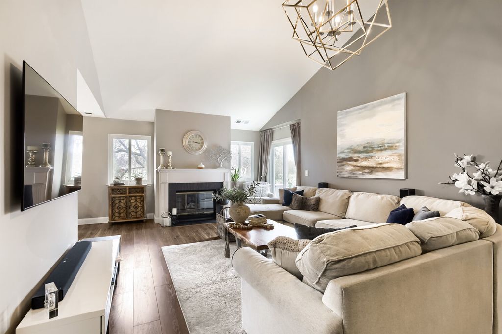 Located in the desirable Lexington in the Park subdivision and within the highly sought-after Stevenson High School District, this bright and inviting 3-bedroom, 2-bath condo offers stunning views of the golf course, park, and Buffalo Creek. The open interior features soaring cathedral ceilings, a cozy fireplace, and a spacious private balcony, while the fully remodeled kitchen (2020) boasts granite countertops, stainless steel appliances, a pantry, and flows into a separate dining area. The primary suite includes a private en-suite bath, a stylish accent wall, and a walk-in closet, complemented by ample closet space throughout and ceiling fans in all bedrooms. Recent updates include new windows (2022) and a water heater (2024), making this home truly move-in ready. Additional highlights include a well-kept laundry room with a full-size washer and dryer, a one-car garage with attic storage, and convenient access to the clubhouse, outdoor pool, and scenic walking and biking paths just steps away.