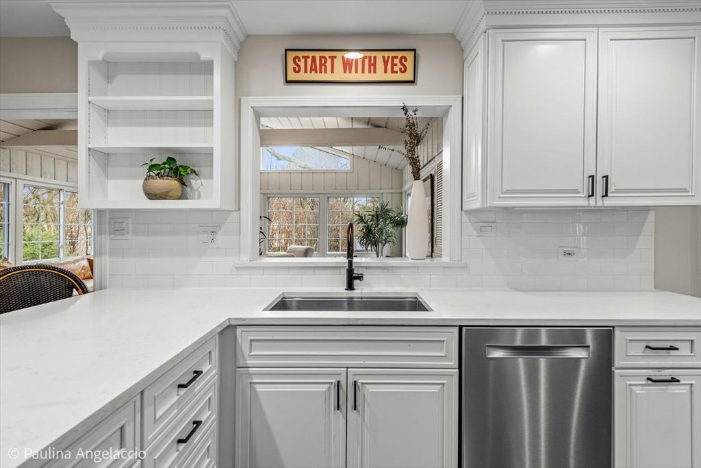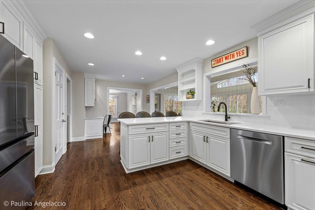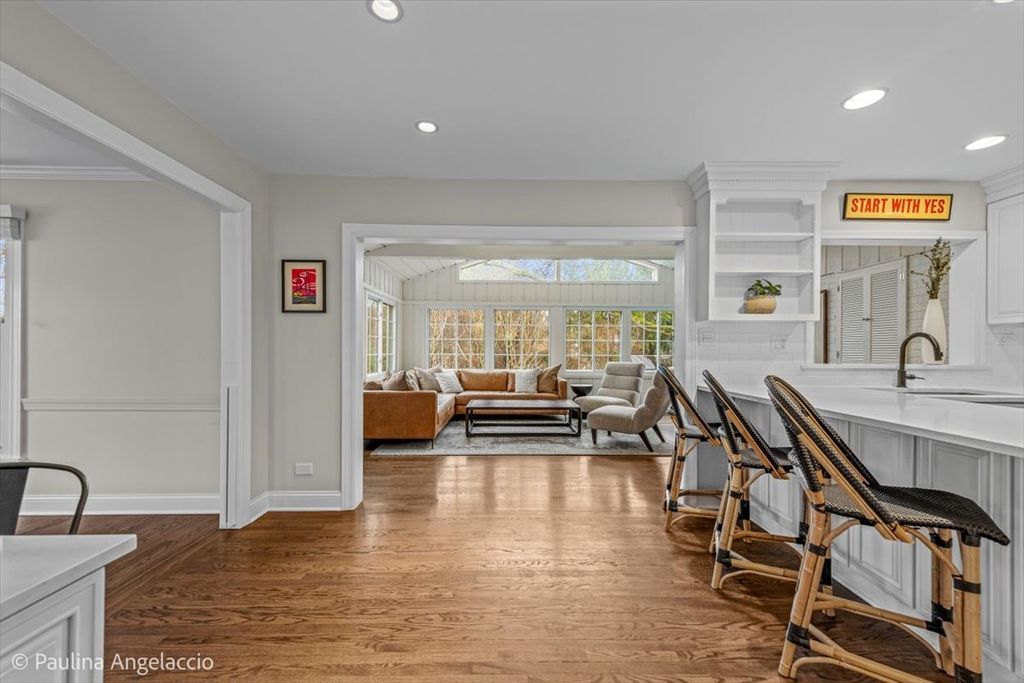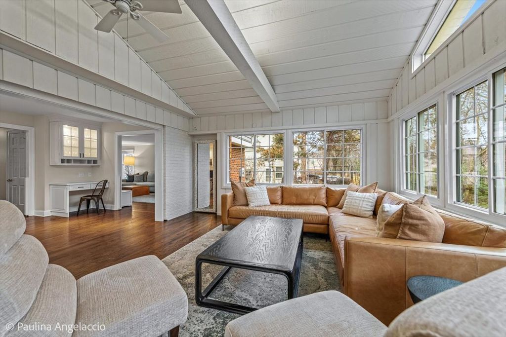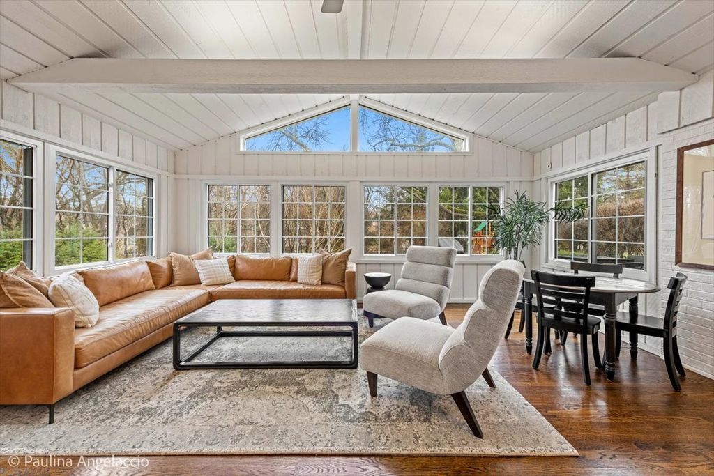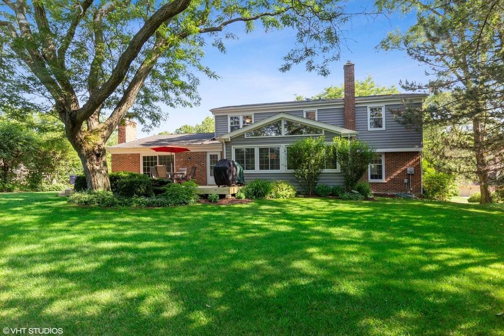 Chic and sophisticated, this picture-perfect Fox Point home offers 4 bedrooms and 2.1 baths with a completely turnkey interior designed for both everyday living and effortless entertaining. A light-filled floor plan showcases hardwood flooring flowing seamlessly throughout the main and upper levels, complemented by spacious living room and elegant formal dining room with a convenient pocket door to the kitchen, ideal for hosting gatherings and holiday celebrations. At the heart of the home, the beautifully appointed chef's kitchen features crisp white cabinetry, a peninsula with breakfast bar seating, and an open connection to the sunroom, creating a natural hub for gathering. The sunroom, with its vaulted ceiling and serene backyard views, is the perfect spot to enjoy your morning coffee or unwind in the evening. Double French doors lead into the inviting family room with a cozy fireplace and sliding doors that open to the rear deck, seamlessly blending indoor and outdoor living. A main-level laundry room with exterior access and a stylish powder room add everyday convenience. Upstairs, the gracious primary suite offers an updated ensuite bath, while three additional generously sized bedrooms and a well-appointed hall bath complete the second level. The finished lower level is designed for fun and function, featuring luxury vinyl flooring, a spacious recreation area, exercise room, and abundant storage. Set on a fabulous interior lot, the backyard provides both privacy and plenty of space for outdoor activities and relaxation. Additional highlights include a two-car attached garage with pull-down attic storage. Enjoy all that Fox Point has to offer, including a community pool, sports courts, lake, playground, and vibrant social events. Ideally located near Lines Elementary, ball fields, and just minutes from charming downtown Barrington, Metra, shopping, and dining. A true 10, this is the one you've been waiting for!
