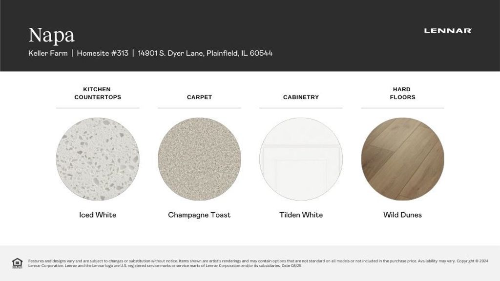 READY FOR AUGUST DELIVERY!! Homesite #081 The Napa is a thoughtfully designed single-story home that perfectly blends modern convenience with comfortable living. This elegant floor plan features two bedrooms, two full bathrooms, and an open-concept layout that seamlessly connects the kitchen, family room, and dining area-creating a welcoming space ideal for both everyday life and entertaining. At the heart of the home, the stylish kitchen showcases a large center island, Quartz countertops, stainless steel appliances, and abundant cabinetry-ideal for meal prep, hosting, or casual dining. A private study provides a flexible space for a home office, reading nook, or creative retreat. Additional conveniences include a dedicated laundry room and a spacious two-car garage for added functionality. The owner's suite offers a tranquil escape, complete with a generous walk-in closet and a luxurious en-suite bathroom. A secondary bedroom and full guest bathroom provide comfortable accommodations for family or visitors. This home also includes 9-foot ceilings, luxury vinyl plank flooring, plush carpeting, Deluxe shower upgrades, smart-height water-saving commodes, and many more premium features designed to enhance your lifestyle. Exterior will be Greystone color siding with Graystone brick. (pic for reference ONLY) *Photos are not this actual home* Experience the best of suburban living at Keller Farm, a thoughtfully planned community coming soon to Plainfield, Illinois. This exciting new neighborhood will feature exceptional onsite amenities, including a nearly 30-acre park, an extensive trail system, and almost five acres of additional parkland-perfect for outdoor adventures, family fun, and everyday relaxation. Located in the thriving city of Plainfield, Keller Farm offers residents the perfect blend of small-town charm and modern convenience. Downtown Plainfield is a vibrant hub of activity, with boutique shops, local restaurants, big box retailers, and major supermarkets all close at hand. Whether you're running errands or enjoying a night out, everything you need is just minutes away. Plainfield is also known for its excellent recreation centers, beautiful parks, and year-round community events. From the festive St. Patrick's Day parade to seasonal artisan markets and the lively Plainfield Fest each summer, there's always something happening to bring neighbors together. At Keller Farm, you'll find more than just a home-you'll find a lifestyle filled with connection, convenience, and community.