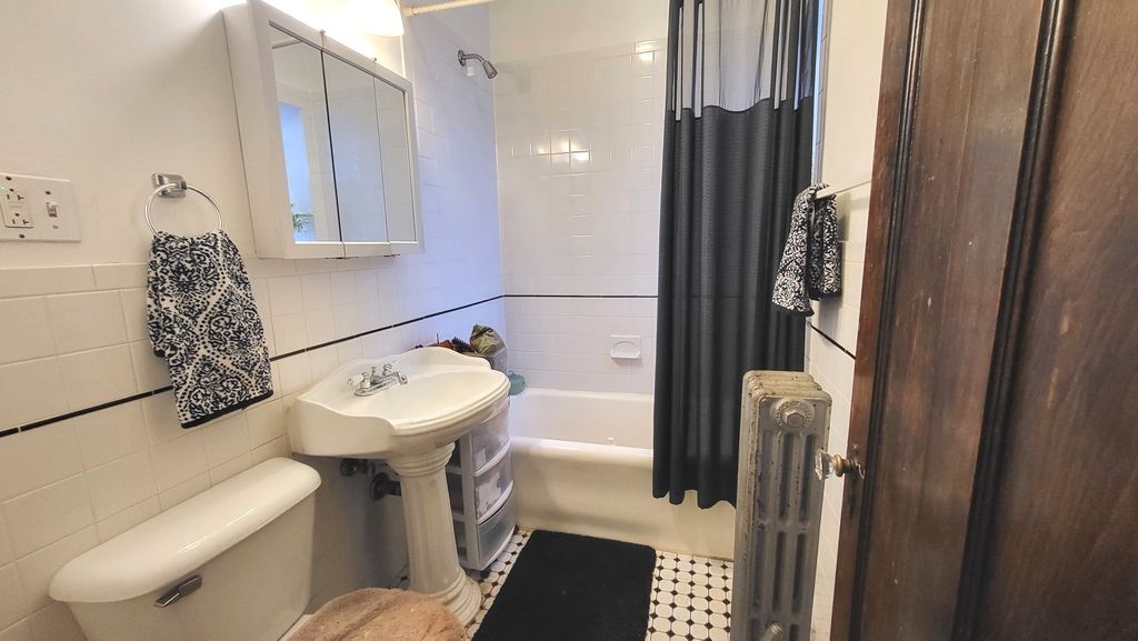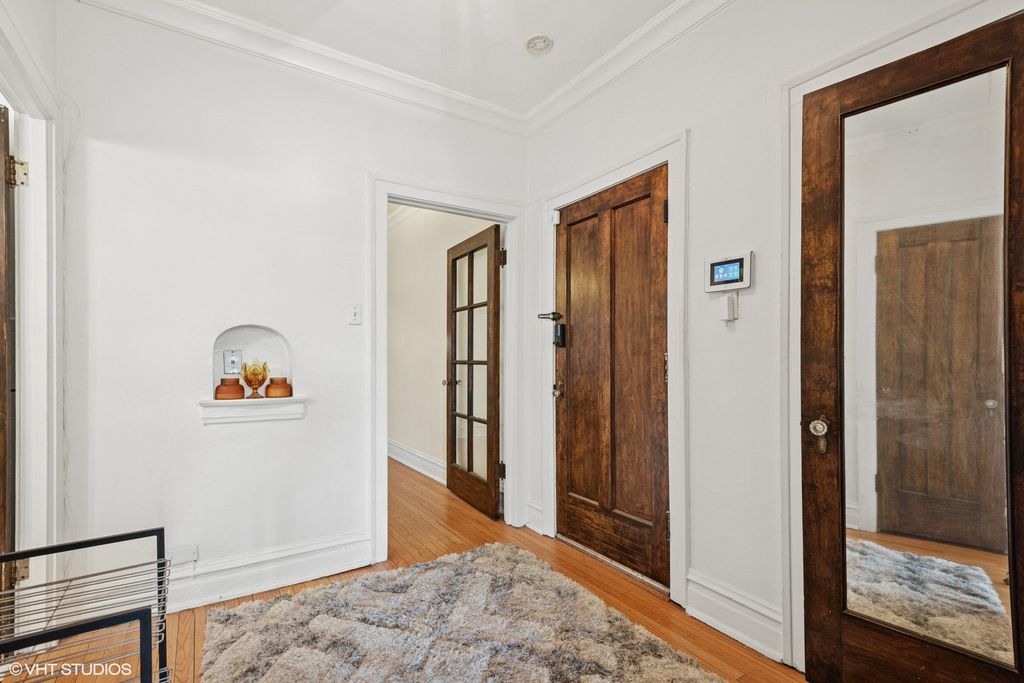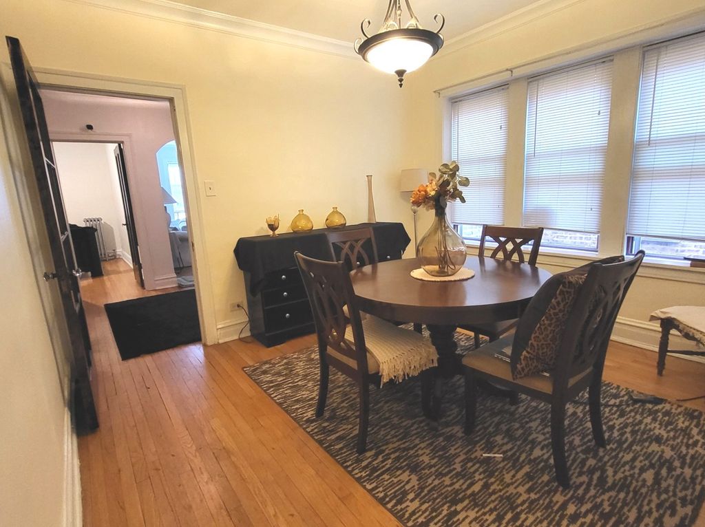 Attractive 1st floor condo in a well-maintained vintage building with hardwood flrs, bay windows, 2 new window air conditioners, formal dining room, modern kitchen cabinets, counter tops, new stainless dishwasher, range and refrigerator, updated electric in the building, open floor plan, walk-in pantry, updated bath, and ample closet space. Perfect location! Village permit parking available right next door or across the street. Steps to the Blue line & downtown Forest Park. Convenient to shopping, dining, entertainment and expressway, See it and Buy it!!