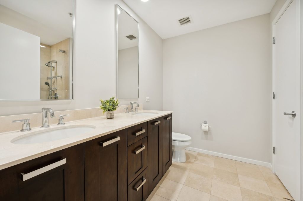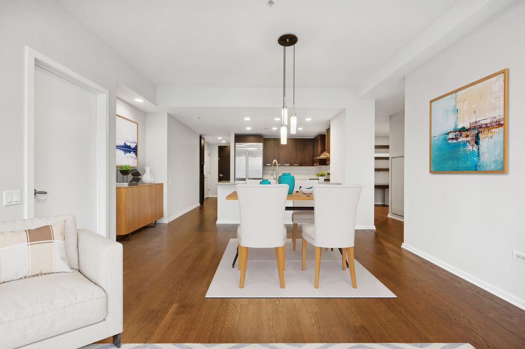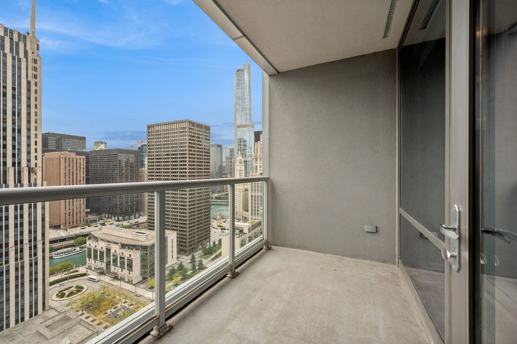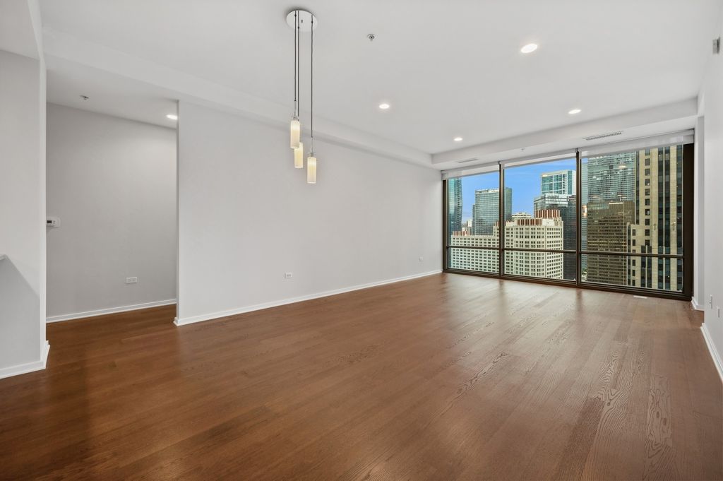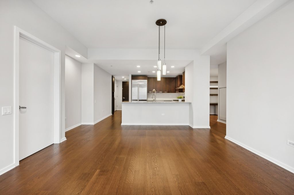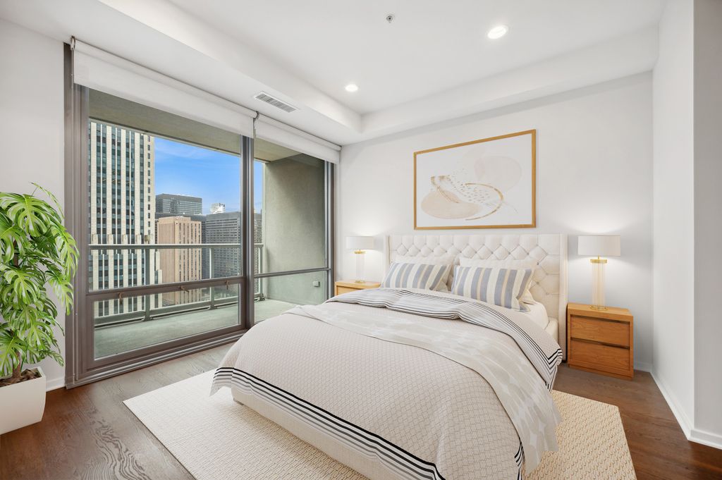 All south-facing two-bedroom plus den, two-bath residence at The Fairbanks. This well-maintained condo offers an ideal Streeterville location within a full-amenity building. The spacious living and dining area is flooded with natural light through floor-to-ceiling windows, creating a bright and inviting atmosphere perfect for relaxing or entertaining, with ample room for a full living room setup and dedicated dining area. The large kitchen features full-height upper cabinets, stone countertops with a breakfast bar and seating for bar stools, a suite of stainless-steel appliances, and plenty of space for preparing your favorite meals. The split-bedroom floor plan provides both privacy and functionality. The primary suite is situated on one side of the home and showcases a wall of windows, professionally built-out double closets, and a connected stone bath with double sinks, linen storage, and a 60" walk-in shower with body sprays, and glass doors. On the opposite side, the second bedroom features a wall of windows and a fully built-out closet system. The den is perfect for a work-from-home setup or flexible living space, complete with a closet and a built-in desk with file drawers and shelving. Hardwood floors throughout enhance the home's overall aesthetic. Enjoy a private south-facing balcony-perfect for grilling or relaxing on warm summer evenings. A full-size stackable washer and dryer add everyday convenience. This professionally managed, full-amenity building offers 24-hour door staff, an exercise room, outdoor pool, sundeck, landscaped park area with grilling stations, entertainment suite, conference room, theater room, dog run, and an on-site package room with dry cleaning services. Conveniently located just steps from Whole Foods, Target, Walgreens, a wide variety of dining options, and just blocks from the Northwestern Medical Campus. Deeded parking available for an additional $40,000.
