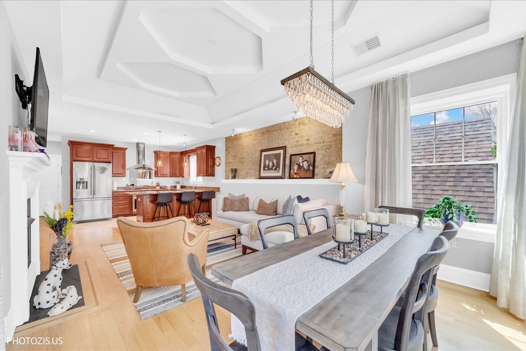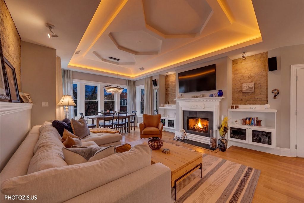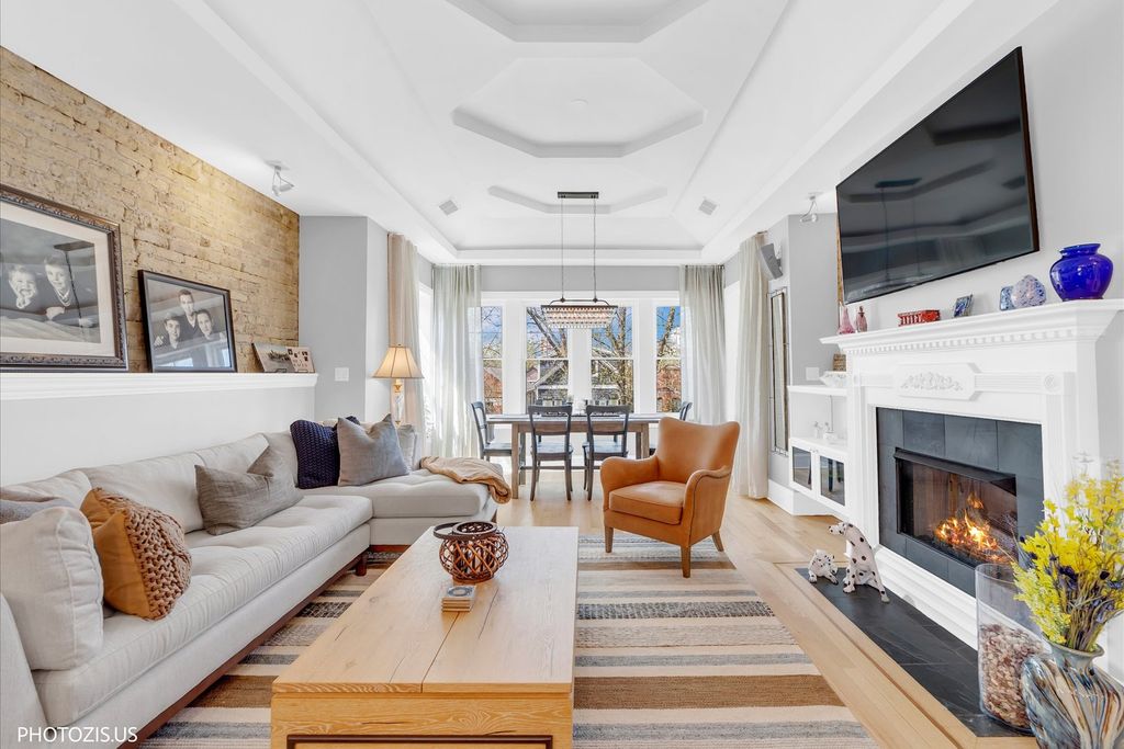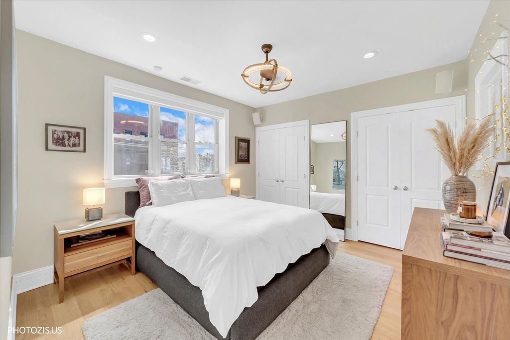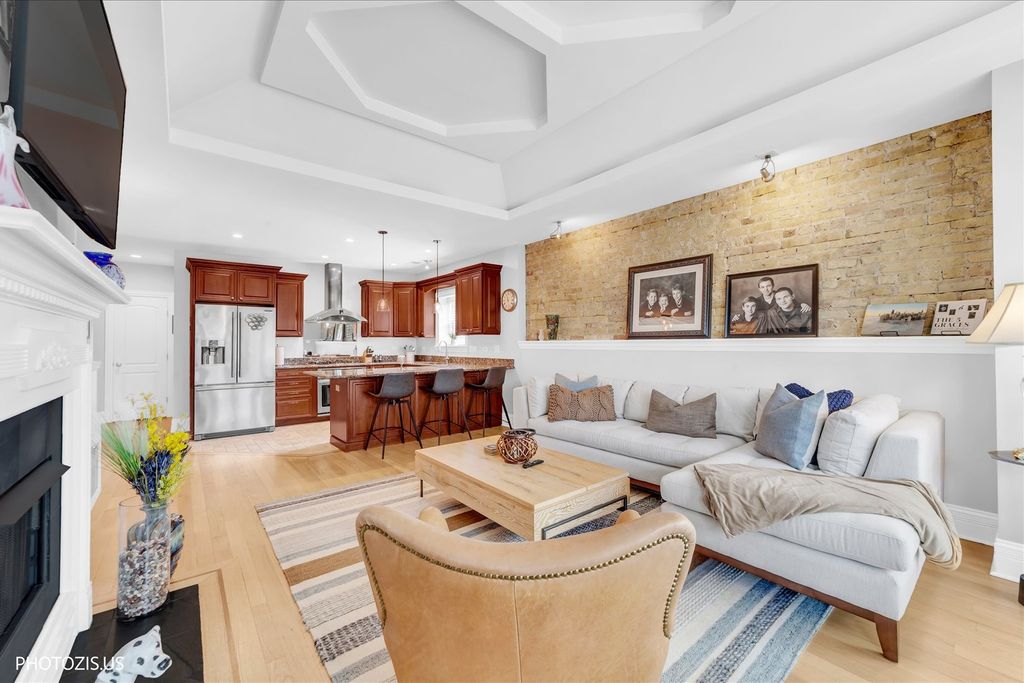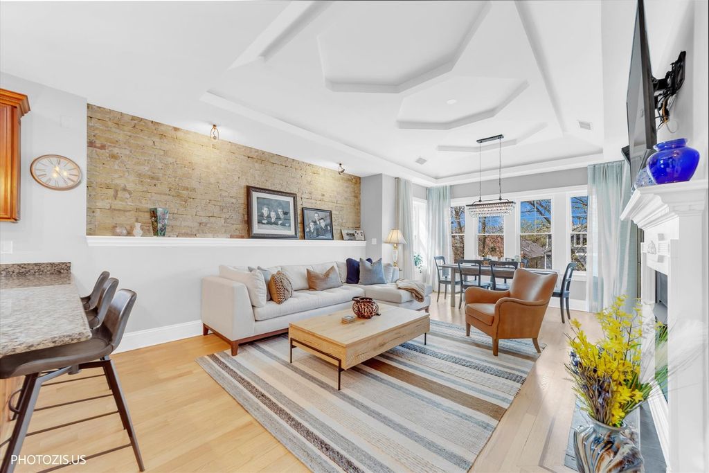 Stunning top-floor Lakeview penthouse with an extra-wide 2 bedroom, 2 bath layout, perfectly situated near the Southport Corridor, the Brown Line, and the highly sought-after Blaine School District. Immaculate and full of natural light, this home seamlessly blends modern amenities with classic charm, featuring thoughtful upgrades throughout. Gorgeous hardwood floors flow throughout, guiding you to a stunning kitchen with custom cabinetry, stainless steel appliances, a vented hood, new Bosch dishwasher, and a breakfast bar with granite countertops. The kitchen opens to an expansive living room featuring a fireplace, exposed brick, coffered ceilings, and large windows, while a bay-windowed sunroom/dining area showcases custom drapes. Two spacious bedrooms, including a primary ensuite with a luxurious bath featuring a separate steam shower with rain head and a whirlpool tub. Custom closets, window treatments, and new LED lighting add both convenience and style. A huge private deck off the hallway completes the space, offering sweeping city views. In-unit washer/dryer, additional storage, and two exterior parking spaces are included. With its fantastic location, you'll enjoy the vibrant Southport Corridor, Irving Park Brown Line station, Lincoln Square, and Lincoln Avenue's shopping and dining options right at your doorstep, offering the perfect blend of tranquility and convenience. This is truly an incredible find in one of Chicago's most desirable neighborhoods!