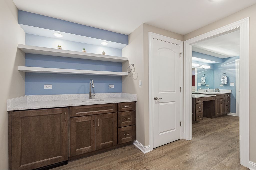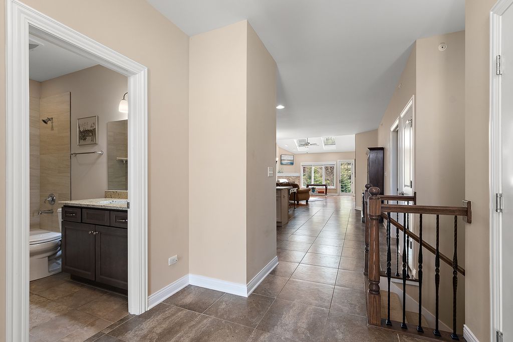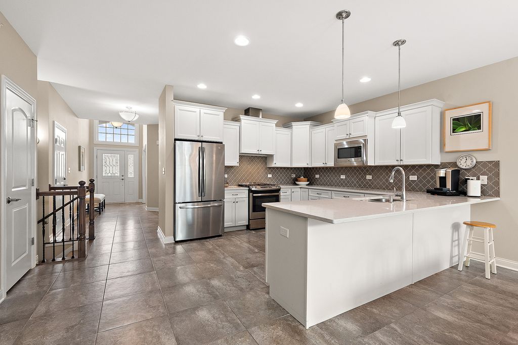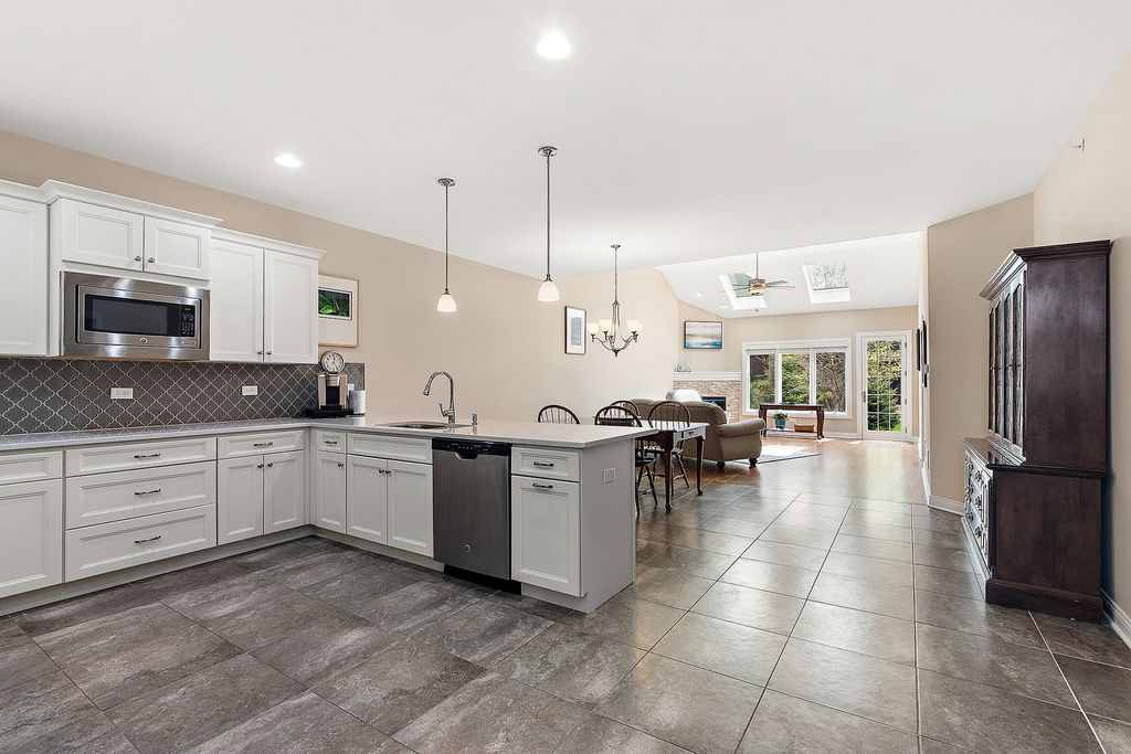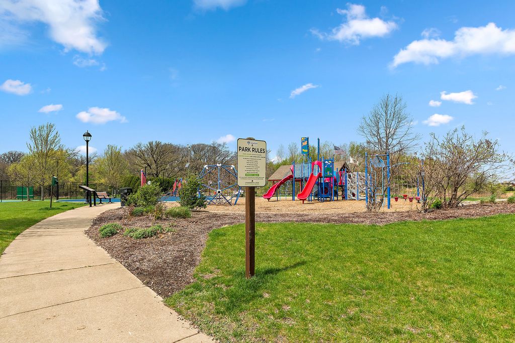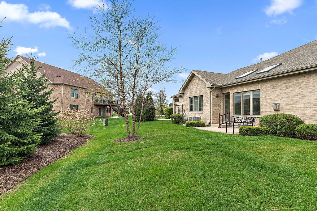 Welcome to this beautiful ranch townhome in the highly sought-after Stonebridge Woods Villas of Homer Glen. Truly move-in ready and like new! Step into a bright, spacious foyer that opens to an inviting floor plan filled with natural light. Vaulted and 9ft ceilings, and white trim and doors throughout. The stunning kitchen features crisp white cabinetry, granite countertops, breakfast bar, and stainless-steel appliances, seamlessly connecting to the main living space-perfect for everyday living and entertaining. The living room features hardwood floors, vaulted ceilings, skylights, a cozy corner fireplace, and direct access to patio. The spacious primary suite offers vaulted ceilings, a walk-in closet, and an en-suite bath complete with dual sinks, a walk-in shower, and separate soaking tub. Convenient first-floor laundry room with utility tub and cabinetry for additional storage. The finished basement provides a separate, private space for recreation or guest quarters, and features a wet bar with refrigerator, and a full bathroom complete with an American Standard walk-in tub and large walk-in shower. Two car garage. Just steps away, you'll find a scenic pond with fountain, walking trails, a park, ball field, tennis courts, and a pavilion. This home combines comfort, style, and convenience in a beautiful community. A must see!