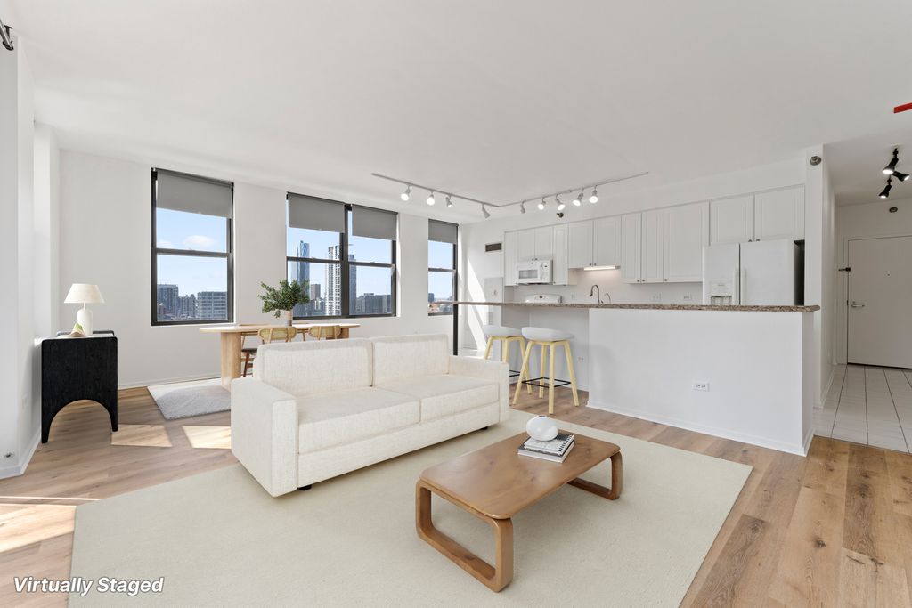 Bright and spacious 17th-floor 2 bed / 2 bath in the highly sought-after Kinzie Station tower in the West Loop. This well-maintained unit offers a great layout with tons of natural light and city views. Open living/dining space leads out to a private East facing balcony, perfect for relaxing or entertaining. Kitchen offers solid cabinet space and a functional layout, ready for your personal touch. Split-bedroom floor plan for privacy. Both bedrooms are generously sized, including a primary suite with its own bath. Full-amenity building with 24-hour door staff, fitness center, and on-site management. Unbeatable West Loop location minutes from Randolph Street dining, Fulton Market, the Riverwalk, parks, and just a 5-minute drive to Whole Foods. Easy access to CTA, Metra, and major highways.
