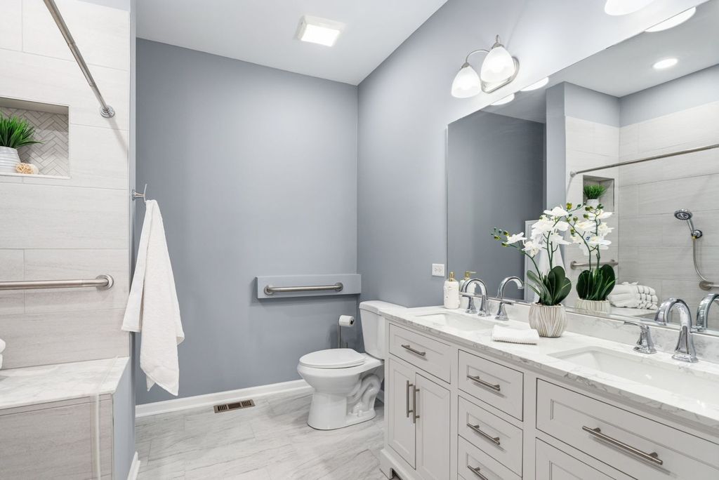 Move-in ready, 2 bedroom, 2 bath ranch duplex unit in the Manors of Patriot Estates! The unit has many upgrades! Gorgeous NEW spa bath with fully tiled walk-in shower, dual vanity with quartz counter, and there are grab bars by the toilet and shower. The primary suite features two closets and beautiful new french doors leading into the room. The kitchen has quartz counters, stainless steel appliances, and a white subway tile backsplash. The home features oak hardwood floors throughout, and the bedrooms have carpet. The home also has a radon mitigation system, an open floor plan for entertaining, 9 foot ceilings, newer neutral paint and upgraded lighting. Sliding doors lead to the concrete patio for easy barbecuing or a great place to sit and relax! All exterior maintenance is included in this 55 and up active adult community AND includes membership to Irish Prairie health Club. No more lawn maintenance and no more snow removal as your association dues take care of that!