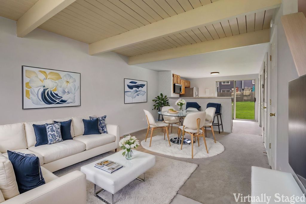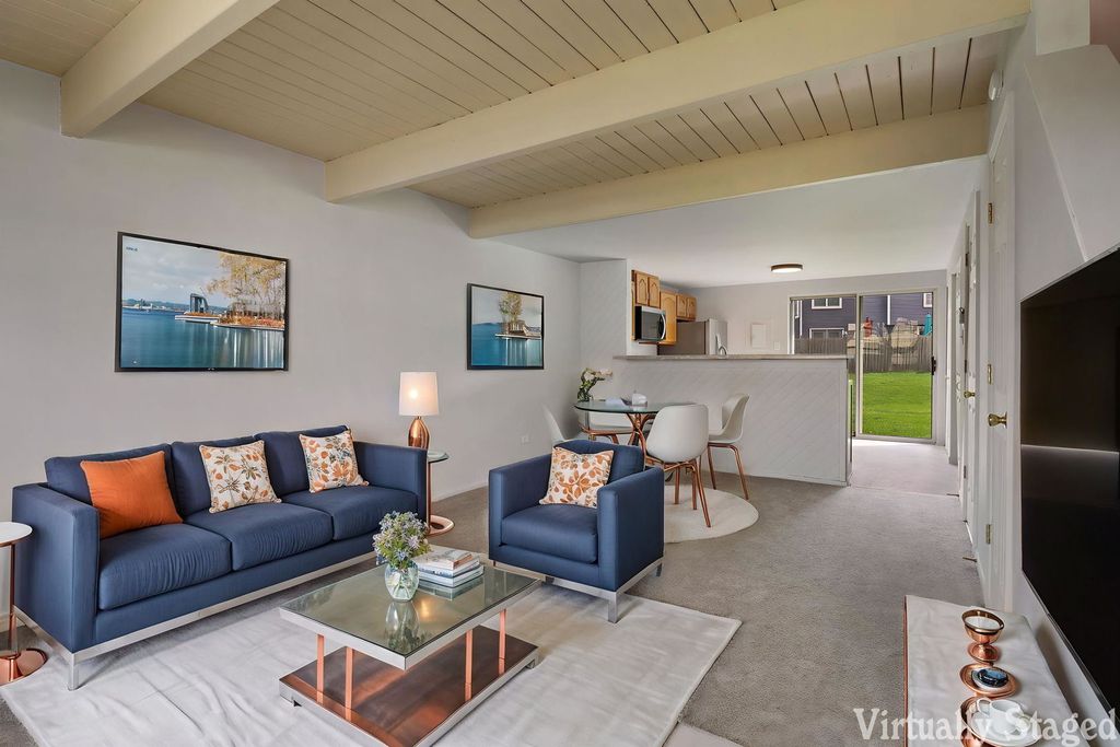 You'll love this townhome with fresh paint & carpeting and walking distance to shopping and amenities. Open floor plan feels spacious with lots of daylight from East and West. Room for your dining table in either the Living/Dining or the Kitchen which features sliding glass doors to a wide open back yard, plenty of cabinet and counter space and a breakfast bar. New appliances are an added bonus. A laundry closet and 1/2 bath complete the first floor. The bedrooms, one with a walking closet, are bigger than you'd expect with the Primary featuring an 8' closet. The full bath has been updated with a new vanity. Nothing to do but move in. It is located an a quiet cul de sac just steps from the community playground. Don't miss it! Tax will be reduced if owner-occupied.