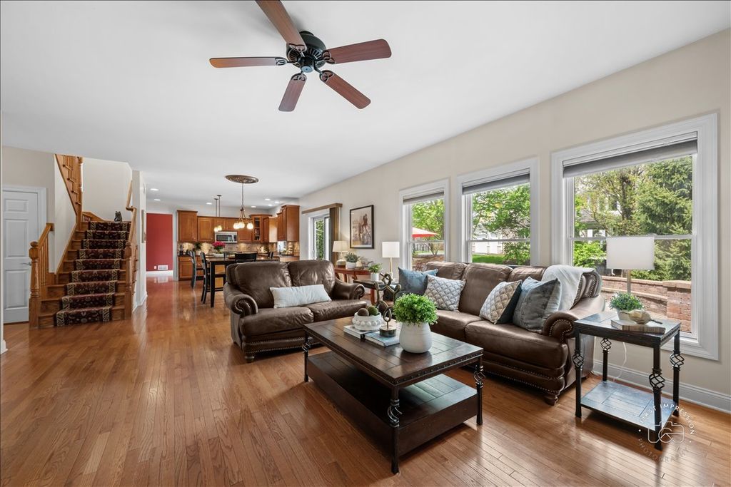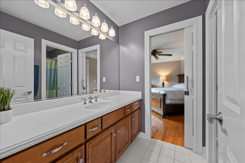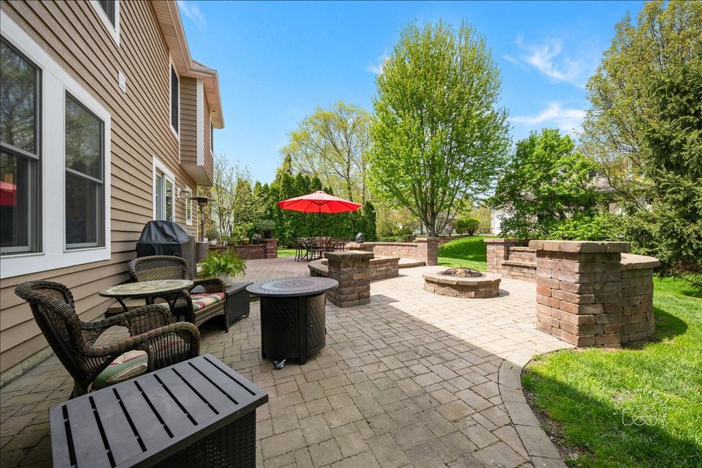 Welcome home to this beautifully maintained gem where soaring 12-foot ceilings, sun-drenched rooms, and thoughtful upgrades come together in one effortlessly inviting package. Freshly painted and newly stained in 2026, this extended floorplan is the rare home that feels as good as it looks - with over 4,400 square feet of total living space designed for both everyday comfort and easy entertaining. From the moment you step into the large, airy foyer, you'll notice the rich hardwood floors and custom millwork that carry throughout the home. The extended floorplan adds extra depth to both the kitchen and family room, giving these everyday spaces a generous, unhurried feel. The kitchen shines with granite countertops and a wonderful eat-in area, flowing naturally into the family room where a cozy fireplace anchors the space. A clever split-stair design connects front and rear entries while pulling in even more natural light. Upstairs, four bedrooms offer flexibility for every need. The oversized primary suite is your private retreat, complete with a spacious ensuite bath and walk-in closet. A second bedroom enjoys its own ensuite - ideal for guests or a teenager who loves their privacy - while two additional bedrooms share a well-appointed Jack and Jill bath, a layout that's as practical as it is charming. A large first-floor laundry room off the garage is ready for built-ins or mudroom cubbies - because storage here is truly everywhere, from the main level right down to the finished basement with its two dedicated storage rooms and convenient half bath. Outside, professional landscaping sets the stage for a stunning multi-level paver patio with a built-in fire pit, dining area, and multiple seating zones - perfect for long summer evenings. A full sprinkler system keeps everything looking its best with minimal effort. And with a new roof, furnace, and air conditioner all replaced in 2025, you can simply move in and enjoy. Meticulously maintained and move-in ready - this one checks every box.