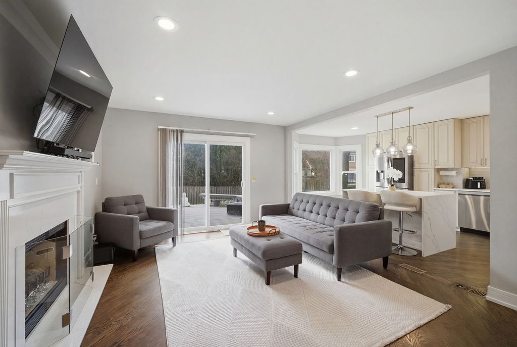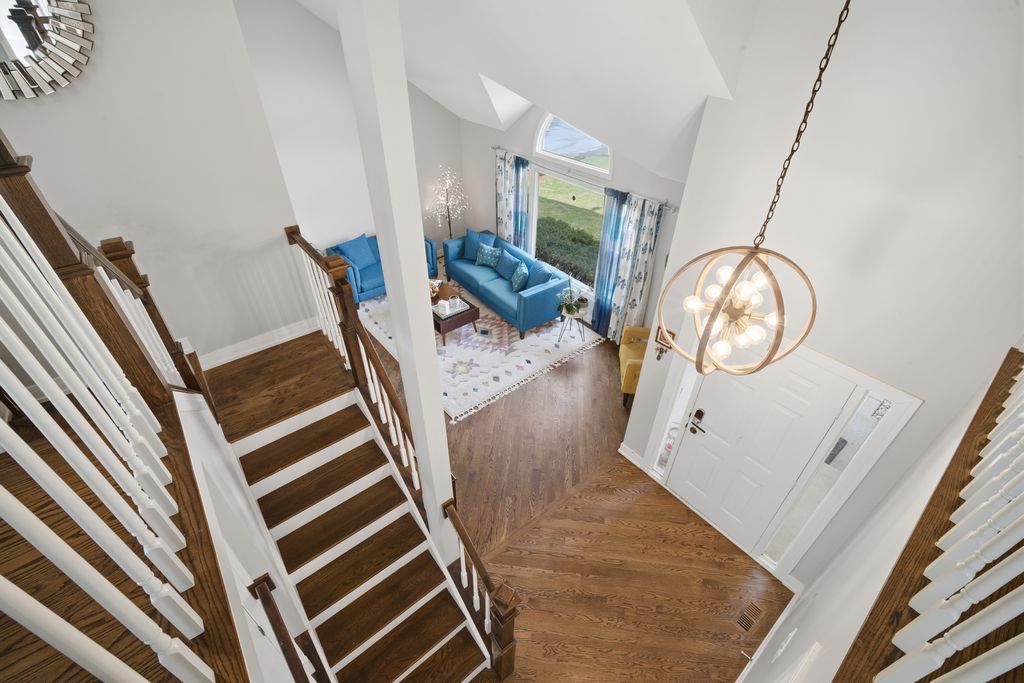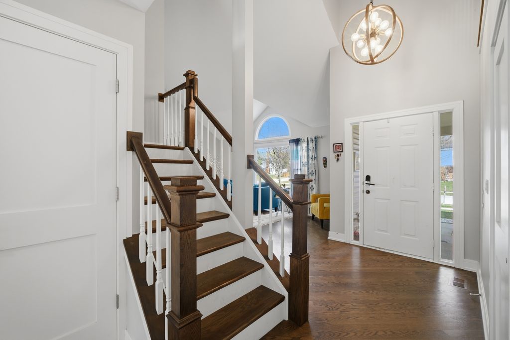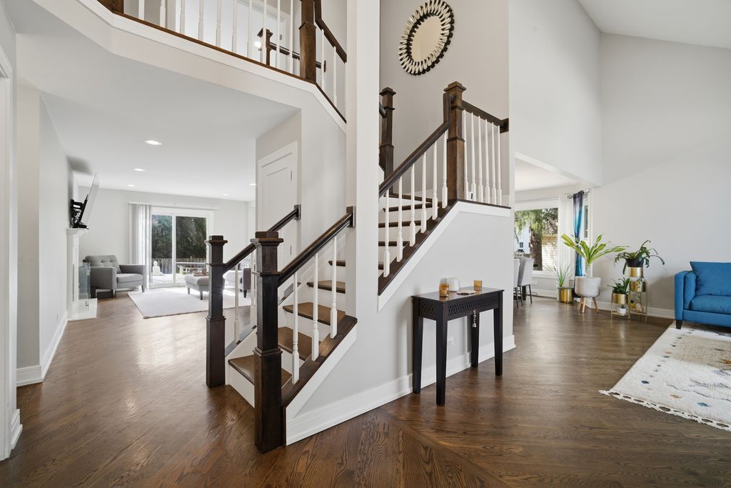 Step into a home that truly delivers on style, space, and sophistication in the sought-after Woodlands of Fiore in Buffalo Grove and the highly sought after Stevenson HS District! Everything has been thoughtfully updated with a modern palette and high-end finishes, creating a move-in-ready retreat filled with natural light. From the moment you enter, you're greeted by a dramatic two-story foyer and soaring vaulted living room, where expansive picture and Palladian windows flood the space with sunlight and highlight the gleaming hardwood floors throughout. Designed for both everyday living and entertaining, the L-shaped dining room flows seamlessly into a completely reimagined kitchen featuring brand-new stainless steel appliances, crisp white quartz countertops, and a stunning marble tile backsplash. The sunny bayed eating area overlooks the backyard, while the inviting family room showcases a sleek marble-surround fireplace and direct access to the deck. This spacious 5-bedroom 3 Bathroom home offers incredible flexibility, including a highly desirable first-floor bedroom-perfect for guests, in-laws, or a private home office and a full beautifully updated bathroom. Upstairs, the luxurious primary suite is a true retreat, complete with its own private deck/balcony, a spa-inspired bath with dual quartz vanity, soaking tub, and frameless shower, plus a custom-converted loft turned into an expansive dream closet. Three additional generously sized bedrooms offer abundant natural light and share a well-appointed full bath. The finished basement adds even more living space with a recreation room, media area, and ample storage. Outdoors, enjoy a beautifully landscaped backyard with a two-tier deck-ideal for relaxing or entertaining all season long. All of this, plus award-winning Districts 96 & 125, serving Ivy Hall Elementary and Stevenson High School. Ideally located just minutes from Transportation, Metra, Expressways, Parks, Pool, Library, Shopping, Dining, Whole Foods(coming soon), and more. A rare combination of modern updates, thoughtful design, and exceptional space-this is the one you've been waiting for! This GORGEOUS property will not last long!
