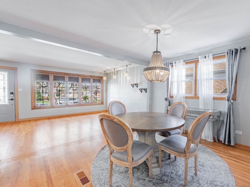 Well maintained and thoughtfully updated oversized brick raised ranch offering exceptional space and functionality, featuring a new full HVAC system, updated electrical, and a roof and windows approximately 5 years old for added peace of mind; the main level boasts hardwood floors throughout, a bright gourmet kitchen with skylight, all stainless steel appliances, and a dining area with a stylish dry bar, along with a full bathroom, while the freshly painted finished basement includes an additional full bath, one bedroom, ample storage, and a separate laundry room, perfect for extended living; exterior highlights include a low-maintenance concrete yard, a garage with a new roof, and a unique entertainment bar setup with wine cooler, making this home ideal for comfortable living and hosting.