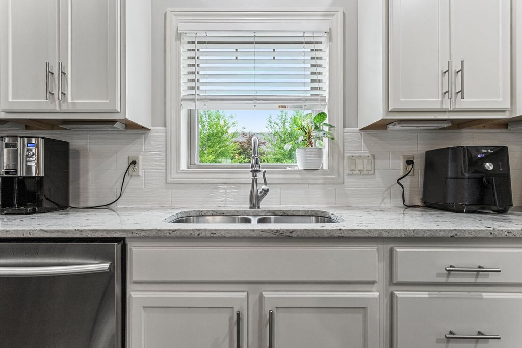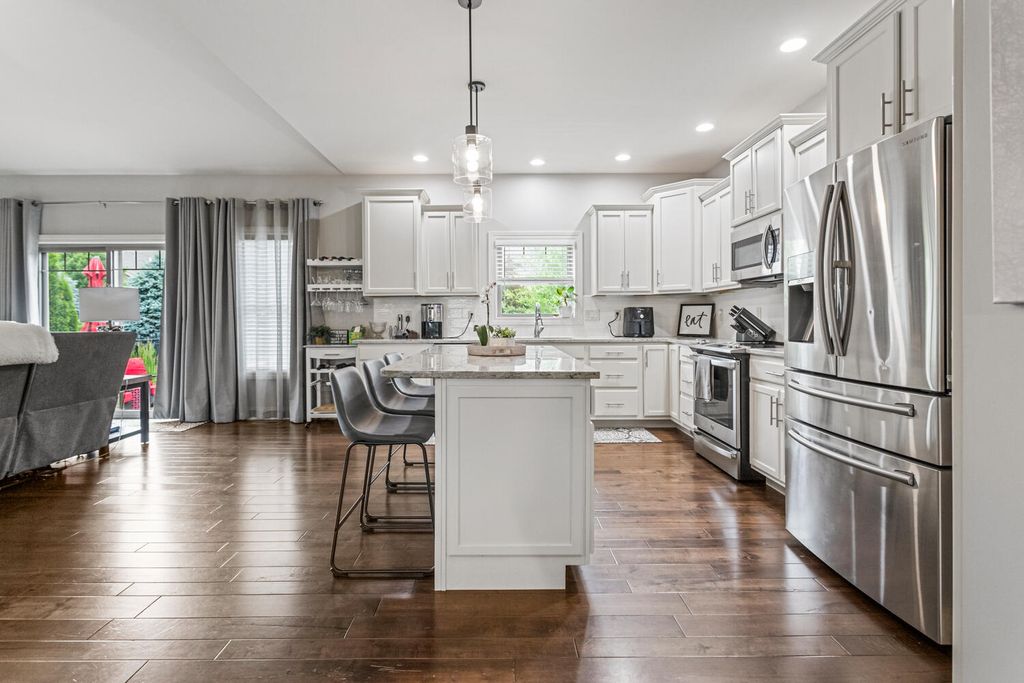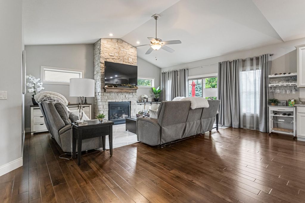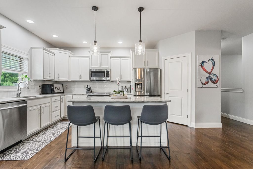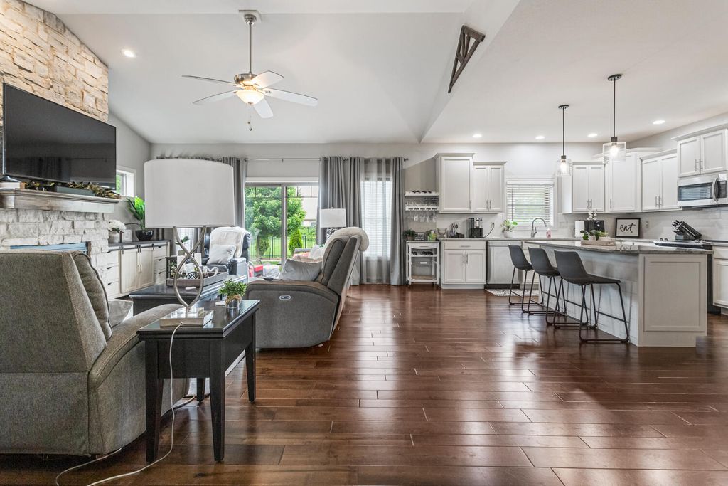 This beautifully maintained, better-than-new ranch home offers the ideal blend of thoughtful design, finished amenities, and an unbeatable location close to top-rated schools, shopping, and dining-everything today's busy households value most. With 4 bedrooms, 4 full baths, a partially finished basement, and a 3-car garage, the open-concept layout is both functional and inviting. The cathedral-ceiling great room centers around a cozy gas-log fireplace and flows seamlessly into a dedicated dining area-perfect for everyday living and entertaining alike. The kitchen is a true gathering space, featuring a large granite and shiplap island, stainless steel appliances, abundant prep space, and hardwood floors throughout the main level. Three bedrooms are located on the main floor, including a spacious primary suite with a spa-like bath offering a soaker tub, walk-in shower, private toilet area, and generous walk-in closet. Practical details elevate daily life, including a separate laundry room with folding space and a welcoming mud/drop zone off the garage complete with bench and coat hooks. A main-floor mother-in-law suite adds flexibility, offering its own private bath and French doors that open to a peaceful private patio. The finished basement expands your living space with a large fourth bedroom, full bath, movie room, built-in desk area, and an impressive 1,238 sq ft of unfinished storage-complete with multiple storage racks, something rarely found in new construction. Step outside to enjoy the professionally landscaped, fully fenced backyard-a standout upgrade you won't get with a new build. Mature plantings, concrete BorderMagic edging, window treatments already in place, and a rear patio off the great room create a move-in-ready outdoor retreat perfect for entertaining or unwinding. This home offers the ease of a newer build without the added expense, time, or hassle-all in a location that keeps you connected to schools, dining, and everyday conveniences.