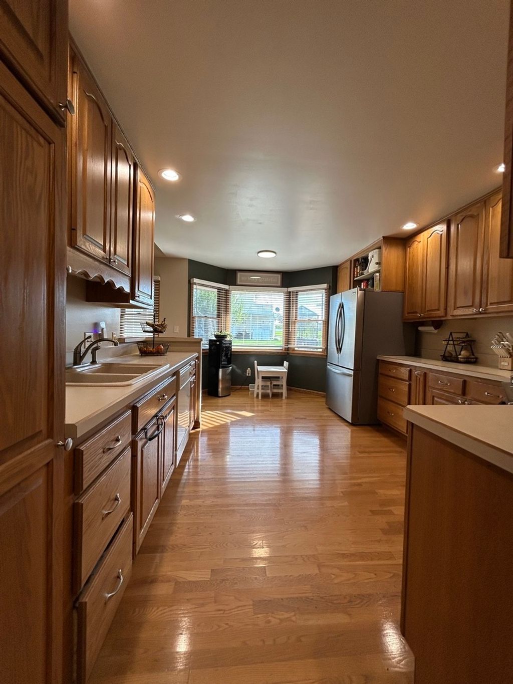 Great Ranch home with 3 BDR's, 2 BA's, attached 2 car garage!! This home has hardwood floors, large great room with dining area, enclosed back sun room, and beautiful new concrete patio too! The oak kitchen is chockfull of storage options with drawers, pantries, extra tall cabinets! Plus a pretty bay window to enjoy with all the natural light beaming thru! The primary bdr has double closets as you pass thru to the ensuite with a large shower, extra large soaking tub in a spacious room. The remaining 2 large BDR's are on the other side of the home with a full bath between them. Main floor laundry is tucked away into a large double closet off the kitchen. This is a very comfortable home just waiting for you!