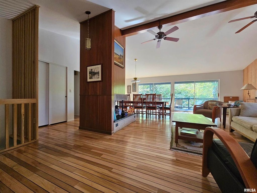 Discover this striking Mid-Century Modern home set on a wooded lot that blends timeless design with comfort and privacy. Every space-whether the great room with its sweeping views or the screened-in porch and deck-offers its own character and sense of calm. Perfect for quiet mornings or relaxing evenings. The floor plan separates the main living area from the bedrooms for added privacy, while the finished basement offers flexible space for living, working, or a potential fourth bedroom. The home has seen extensive interior and exterior updates in recent years. Inside, oak floors have been refinished and rooms freshly painted. The living room features a new oak accent wall and black quartz hearth. The kitchen boasts new appliances, countertops, and oak paneling. Both main-floor bathrooms were remodeled. Other updates include new ceiling fans, central HVAC with a split zone for the primary suite, a new water heater, and a new sump pump. Outside, enjoy a screened cedar porch, deck, and flagstone patio surrounded by mature trees. The exterior features newly painted siding, oversized gutters with guards, updated lighting, a resurfaced driveway with added drainage, and a fenced dog area with three gates. A rare opportunity to own a move-in-ready Mid-Century Modern home where every detail has been cared for. Come experience the style, comfort, and tranquility this home offers-your next chapter begins here.