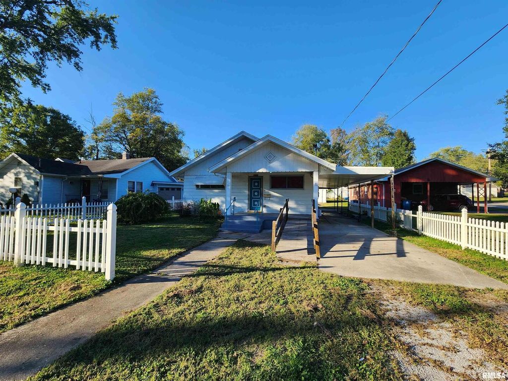 Welcome home! This charming 3-bed, 1-bath gem offers delightful curb appeal with a classic white picket fence and a beautiful vintage front door. The option of ramp access in the front provides easy entry for everyone, and the recent roof and solar panels offer peace of mind and eco-friendly and low cost energy. This home is situated just down the street from the Murphysboro Park District and Riverside Park. Enjoy easy access to the Bocce Courts, Chep Kessel Field, the Band Shell, and the Dog Park. Your covered parking options include an oversized attached 3-car carport plus an additional detached 1-car carport. The outbuilding in the back would be perfect for extra storage, a workshop, or a hobby space. The carpets are even covering original hardwood floors. Don't miss the opportunity to make this charming and upgraded house your new home!
