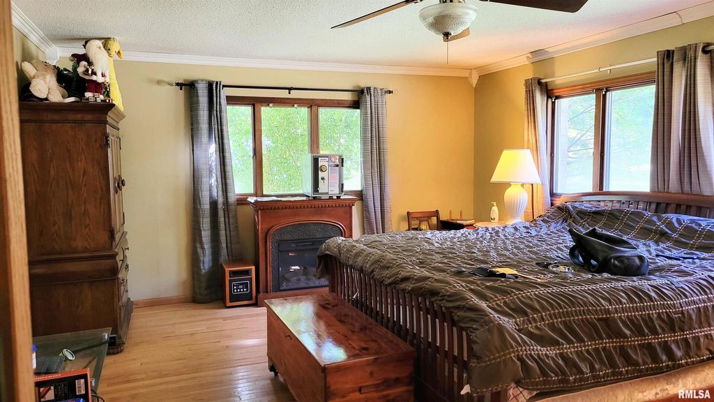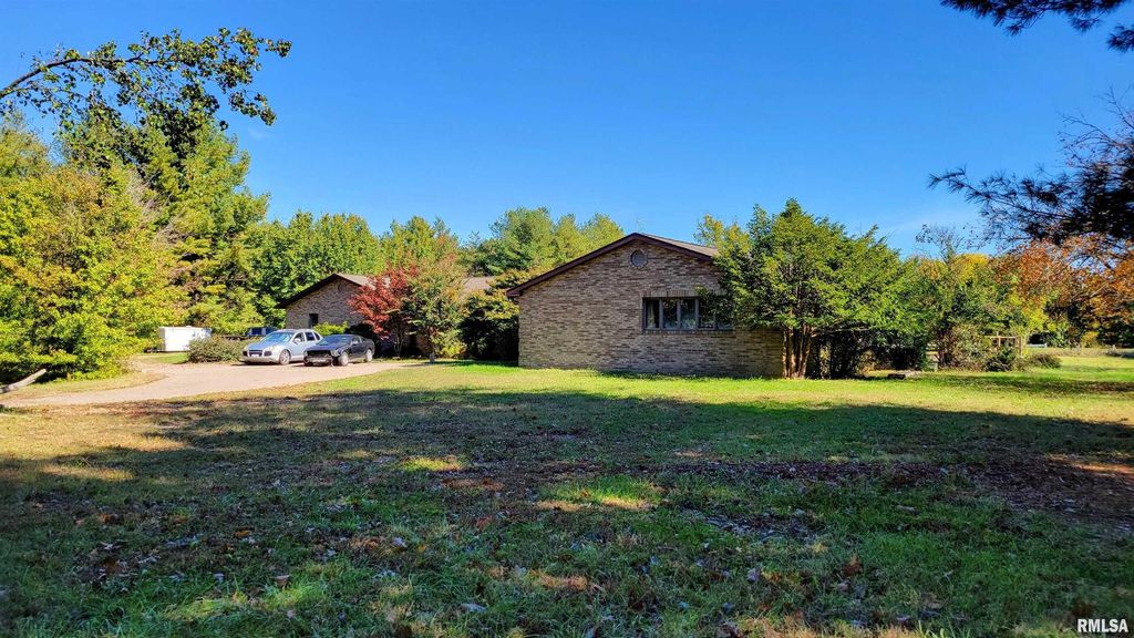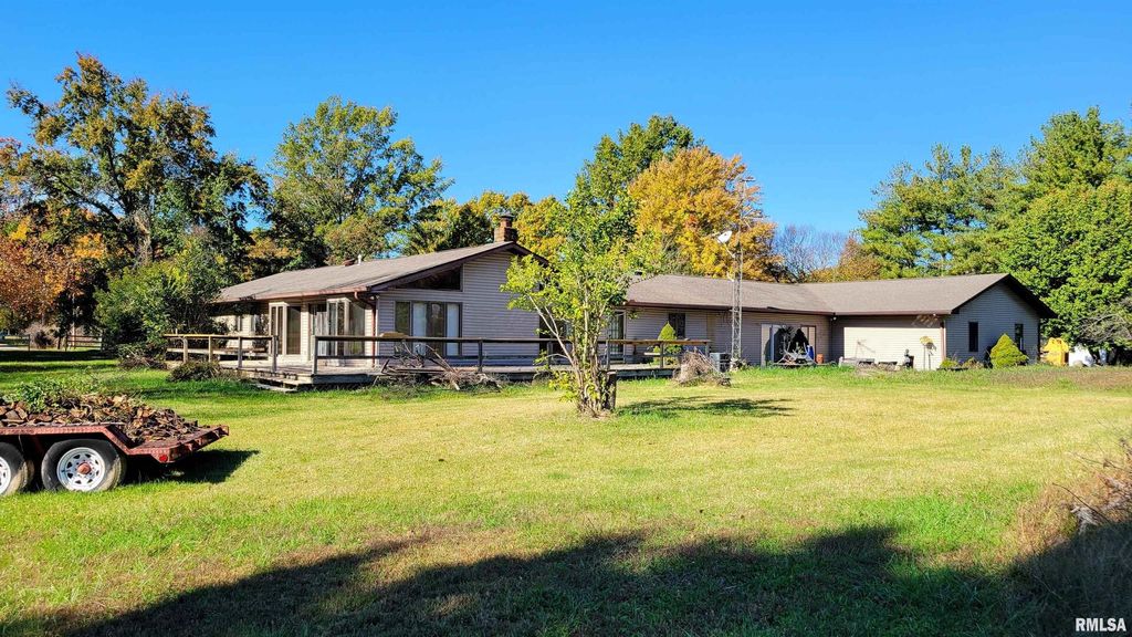 Welcome home to this charming 3-bedroom, 3-bathroom ranch on approximately 24 acres with a pond and stunning views. A paver driveway and mature landscaping welcome you upon arrival. Inside, French doors lead from the foyer into the great room featuring a high vaulted wood ceiling, pool table, and wood-burning fireplace. Natural light floods through two walls of floor-to-ceiling windows and French doors opening to the deck. Down the hallway, two secondary bedrooms flank either side with a shared full bathroom. The spacious primary bedroom at the hall's end offers front yard views and an ensuite with dual sinks, recessed lighting, and glass block shower. French doors on the opposite side of the great room reveal the kitchen with cherry wood cabinetry, stainless steel appliances, and an elongated island featuring a breakfast bar, built-in cabinetry, and cooktop. The spacious laundry room off the kitchen provides ample cabinet space. The full hall bathroom includes a jetted tub and sauna for ultimate relaxation. The den at the hall's end boasts a full wet bar and generous space for an office, home gym, or game room, plus garage access. The 4-car garage features a mechanic lift, storage, and workshop space. The property includes a pond, 18 tillable acres, and three outbuildings (20x40, 20x30, and 45x60 with concrete floor). Don't miss this homestead oasis! Please include any and all buyer requests in the offer to be presented for consideration.