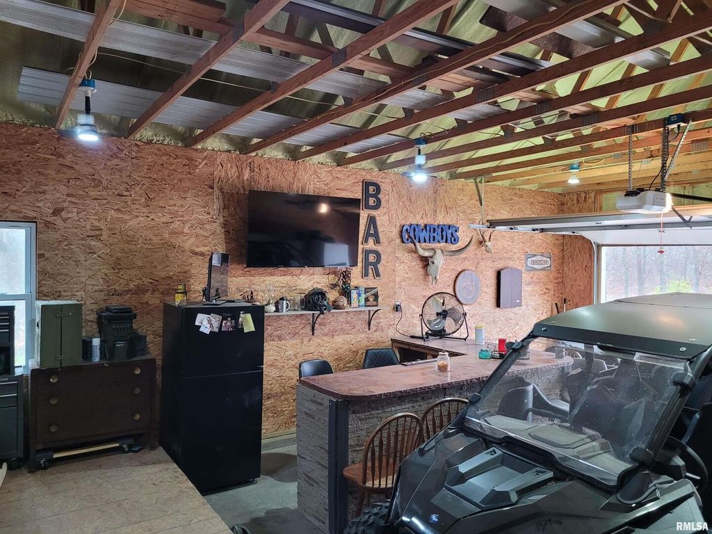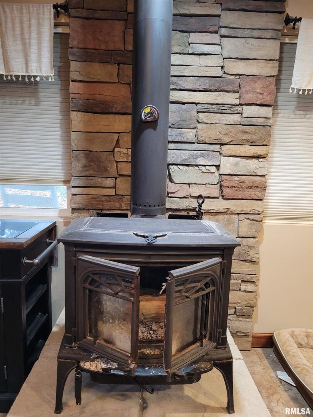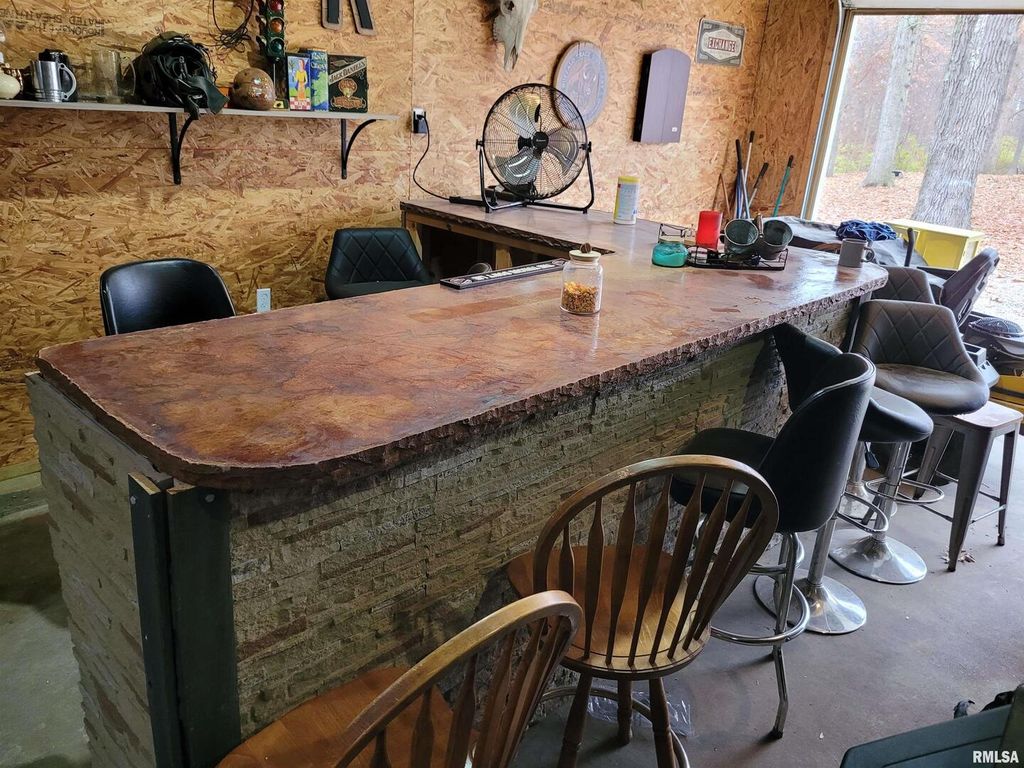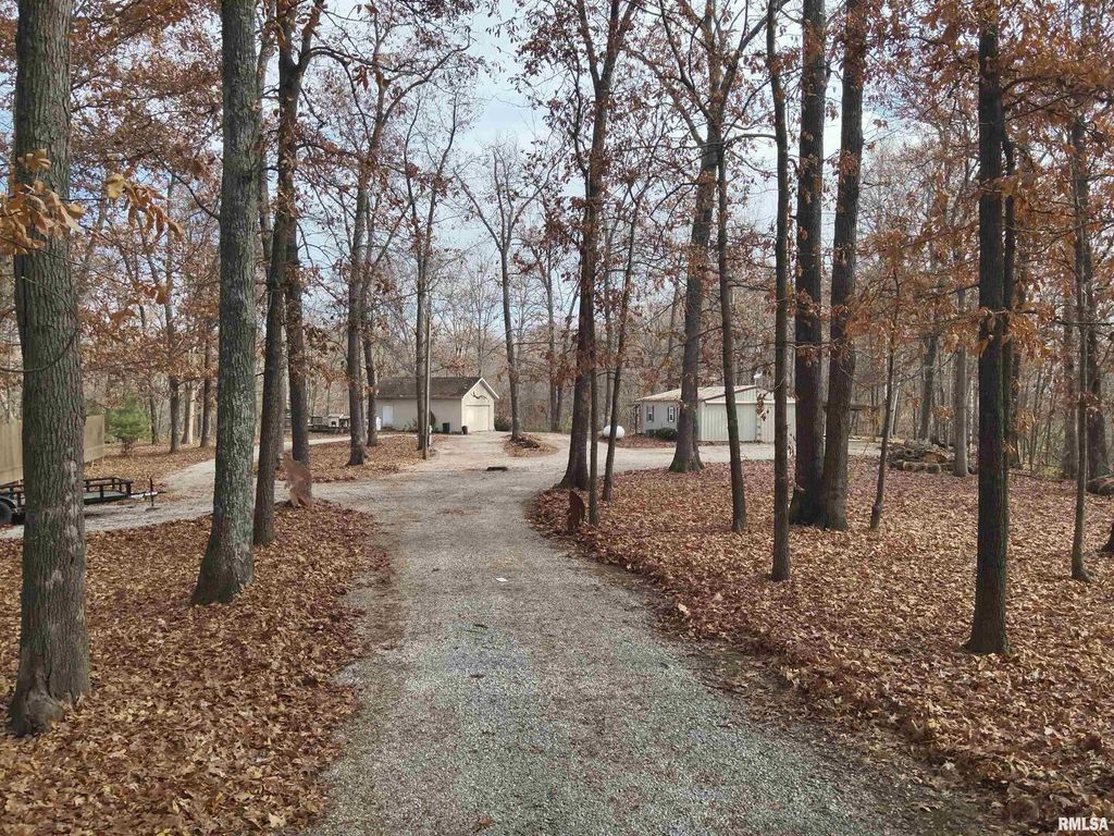 Discover peaceful country living with this unique 2 bed, 2 bath pole-barn style home nestled on 27 wooded acres at the end of a quiet dead-end road. Enjoy morning coffee on the covered porch, relax on the shaded patio, or unwind around the fire pit while taking in the sounds of nature. Inside, the cozy living room features a wood-burning stove, perfect for cool evenings. Outside, you'll appreciate the detached garage complete with a custom-built bar that stays with the property. A 20x8 concrete storm shelter is located behind the garage. Two full RV hookups and plentiful parking offer exceptional convenience for guests or outdoor enthusiasts. With abundant wildlife and room to roam, this property provides the ideal combination of comfort, privacy, and recreation.