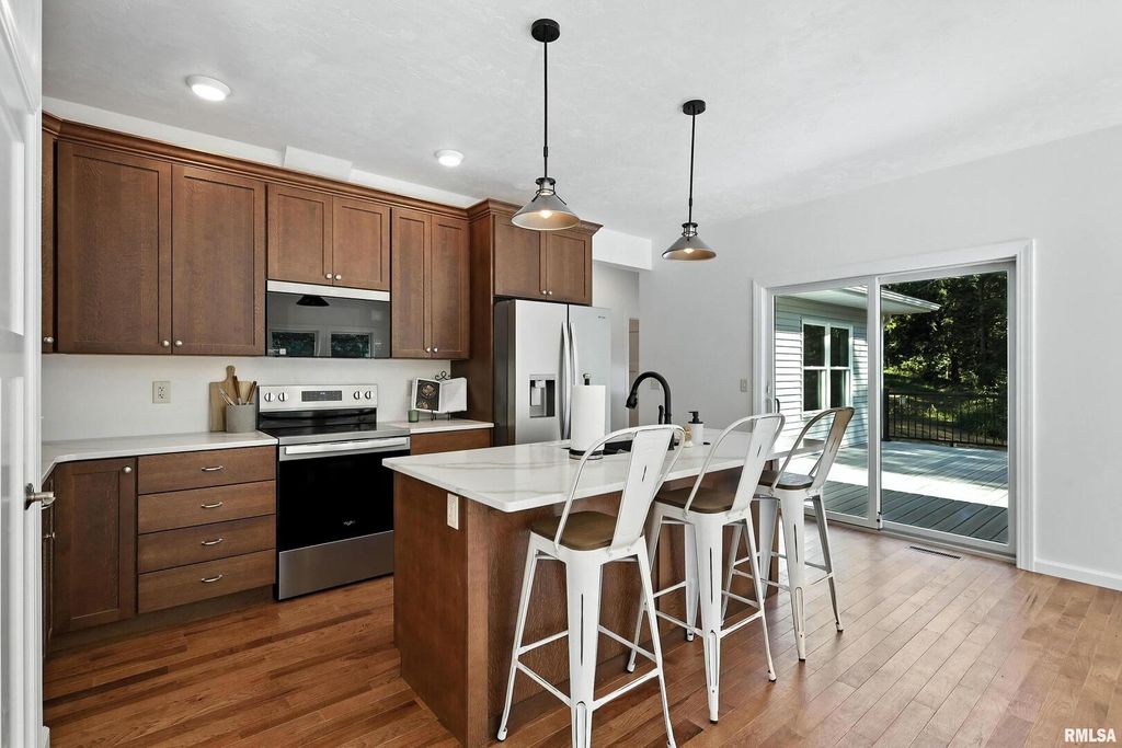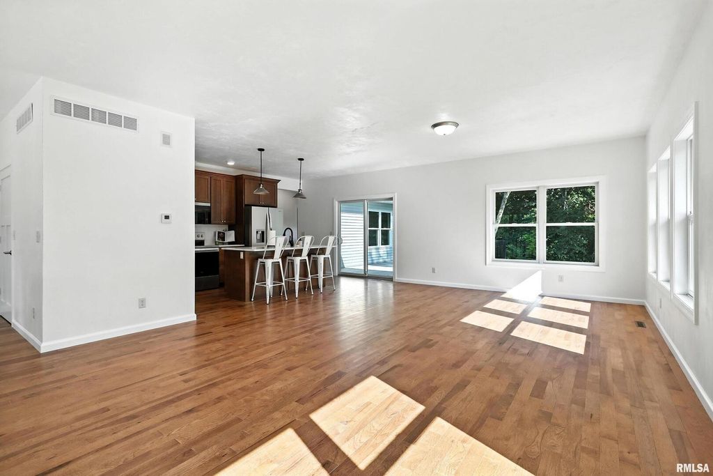 Hickory floors, chefs kitchen and a peaceful creek setting. This custom built new construction by Hancock Construction -Geneseo is nestled on 1.24 acres with mature trees and a natural creek and offers three levels of thoughtfully designed living space. The main level showcases 9 ft. ceilings and beautiful hardwood hickory floors throughout its open concept design. The chefs kitchen complete with stainless steel appliances flows seamlessly into the dining and living room area with walk-out access to a 14x21 deck overlooking the back yard. The primary suite features a walk in closet, private ensuite bath and a custom tiled shower. A convenient laundry room and adjacent half bath complete the main level. Upstairs, a versatile 16 x12 flex space makes the perfect reading nook. Two oversized bedrooms share a full bathroom on this level. The partially finished basement includes a 25 x 29 rec room with a wall of windows and luxury vinyl flooring and a walk out to the patio. The generous storage area has plumbing rough in for a bath and egress window. Additional highlights are a heated and plastered garage with flake epoxy flooring. There is no HOA fees on this property as it has its own well and septic system. This is a rare opportunity to own a quality built with high end finishes, new construction home in a natural setting in Geneseo.