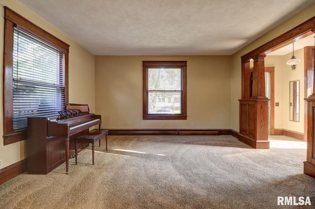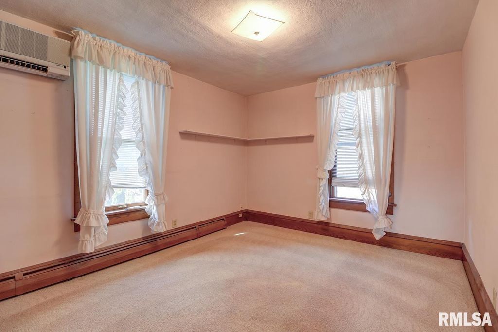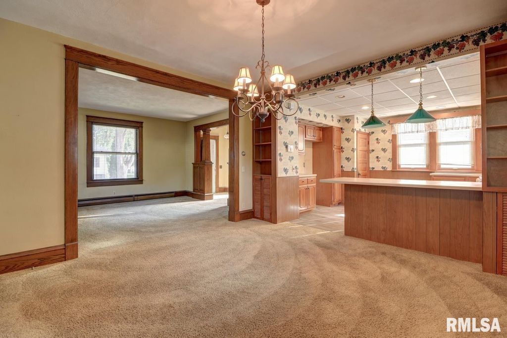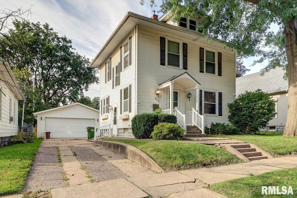Charming two-story home with a four-stall garage. Step into timeless well-maintained two-story home featuring an inviting entryway. The ornate natural wood staircase greets you upon entry and leads into a spacious living room and formal dining room, complete with built-in bookshelves. The dining area flows seamlessly into the kitchen that is thoughtfully designed with a peninsula for extra seating, ample cupboards, and convenient appliance placement. The upper level has a full bath and three comfortable bedrooms, each with its own individual air conditioner. You will also find a hallway closet and access to a walk-up attic, providing excellent storage. Natural woodwork accents the home throughout adding warmth and character. Additional features include zoned hot water heat for comfort and efficiency. This property blends historic charm with a functional design, offering both character and convenience. The same owner has resided in this home since 1976.
