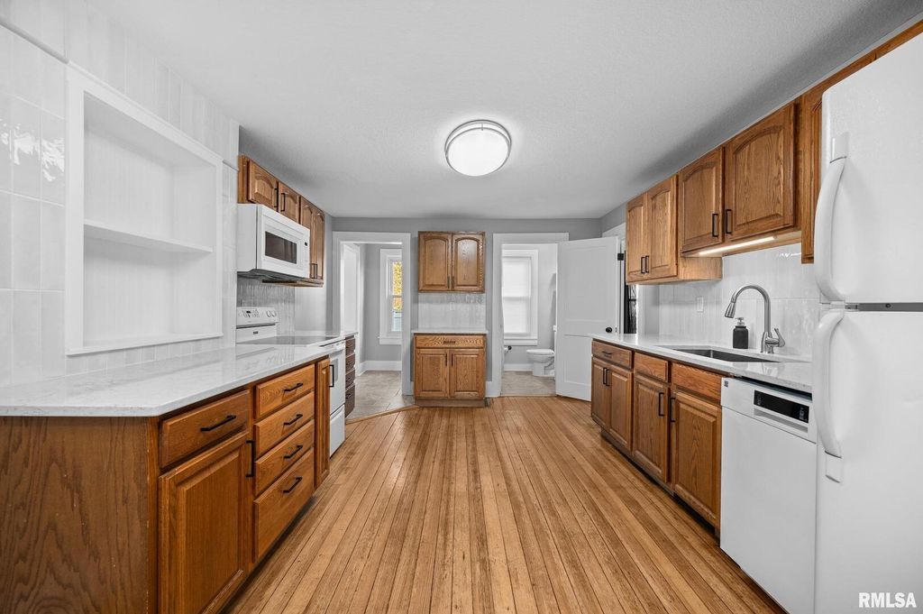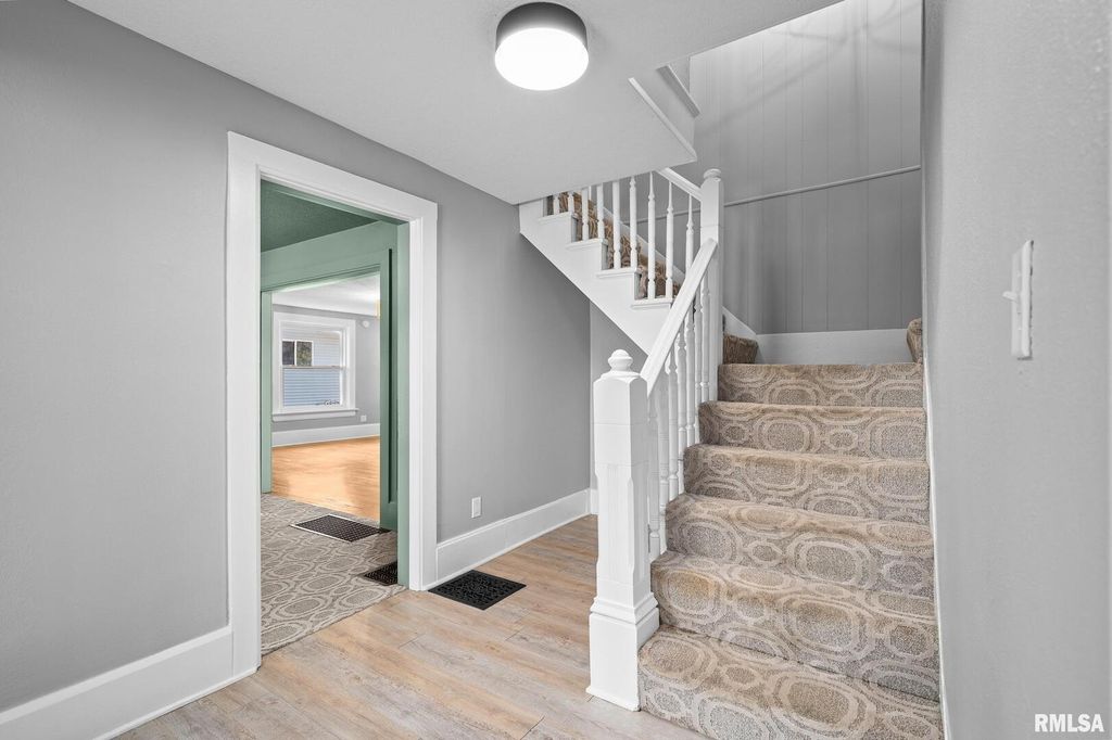 2 Garages! Welcome to this charming 2-story home full of character, located in the desirable North Scott School District. Offering abundant living space, this property features 5 bedrooms, 2 bathrooms, and 2 garages-providing 4 total parking spaces!Step inside to a spacious foyer that flows into the main level. Here you'll find a formal dining room, a flexible bedroom/office space, and a nicely sized living room with hardwood flooring. The kitchen offers ample cabinet storage and has been updated with quartz countertops and a stylish backsplash. At the rear of the home, enjoy a large three-season bonus room, perfect for relaxing or entertaining. Upstairs, you'll discover 4 additional bedrooms, a huge laundry room, and another full bath. This home is built on a solid foundation. Several notable updates, including new roof, new doors throughout the home, updated kitchen countertops and backsplash, fresh interior paint throughout. Buyer and or buyer agent to verify all information, sizes, square footage, figures, school zones, taxes, exemptions, and zoning. Sizes and measurements approximate. Measured lot with county tool, size approximate.