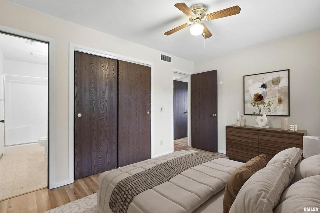 Inviting 2-bedroom, 2-bath condo with secured entry. This pet-friendly building allows dogs up to 40 lbs (no cats) and rentals are permitted-ideal for investors or owner-occupants alike. The primary bedroom features an en-suite bath, and an additional storage closet in the building is included. Conveniently located near John Deere World Headquarters. One or more photo(s) have been virtually staged.