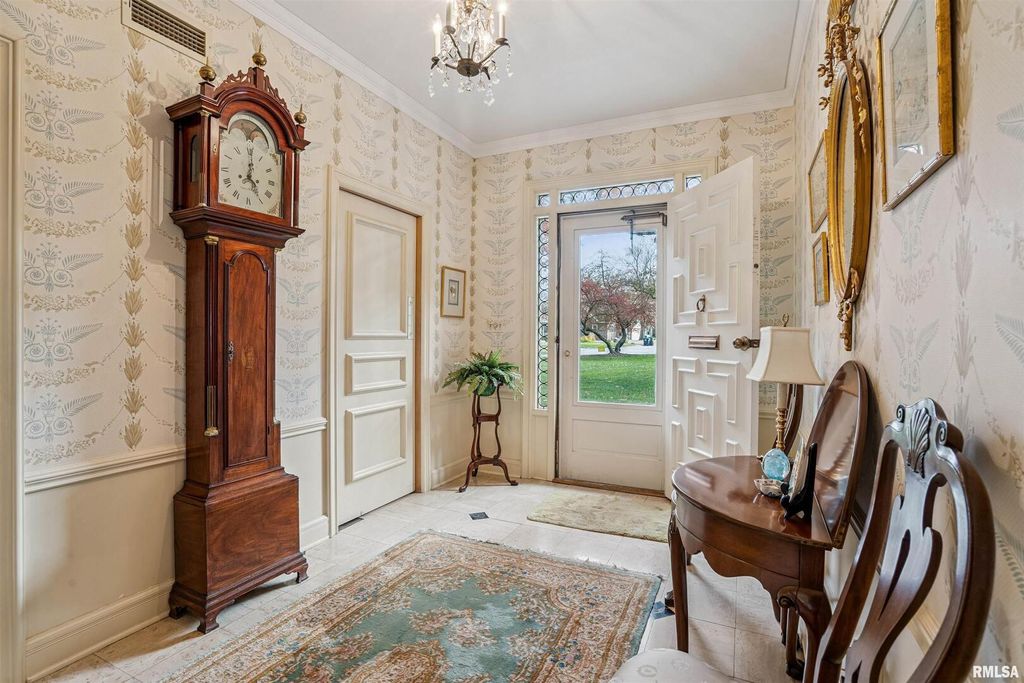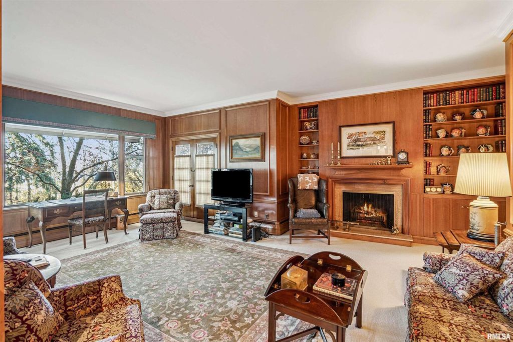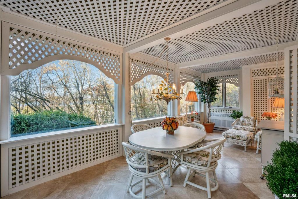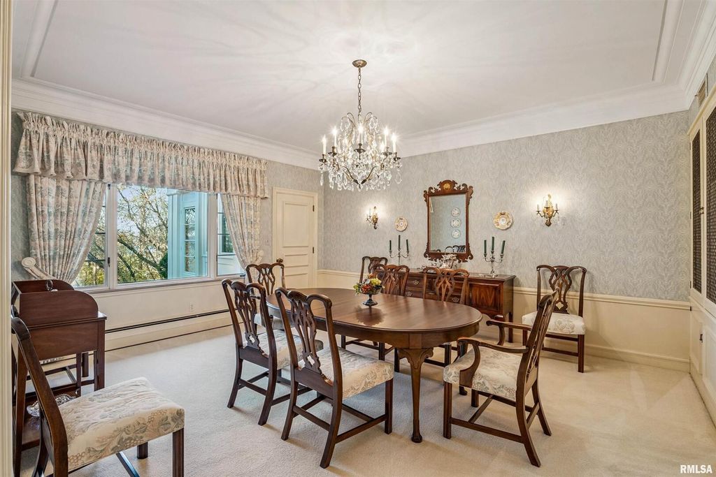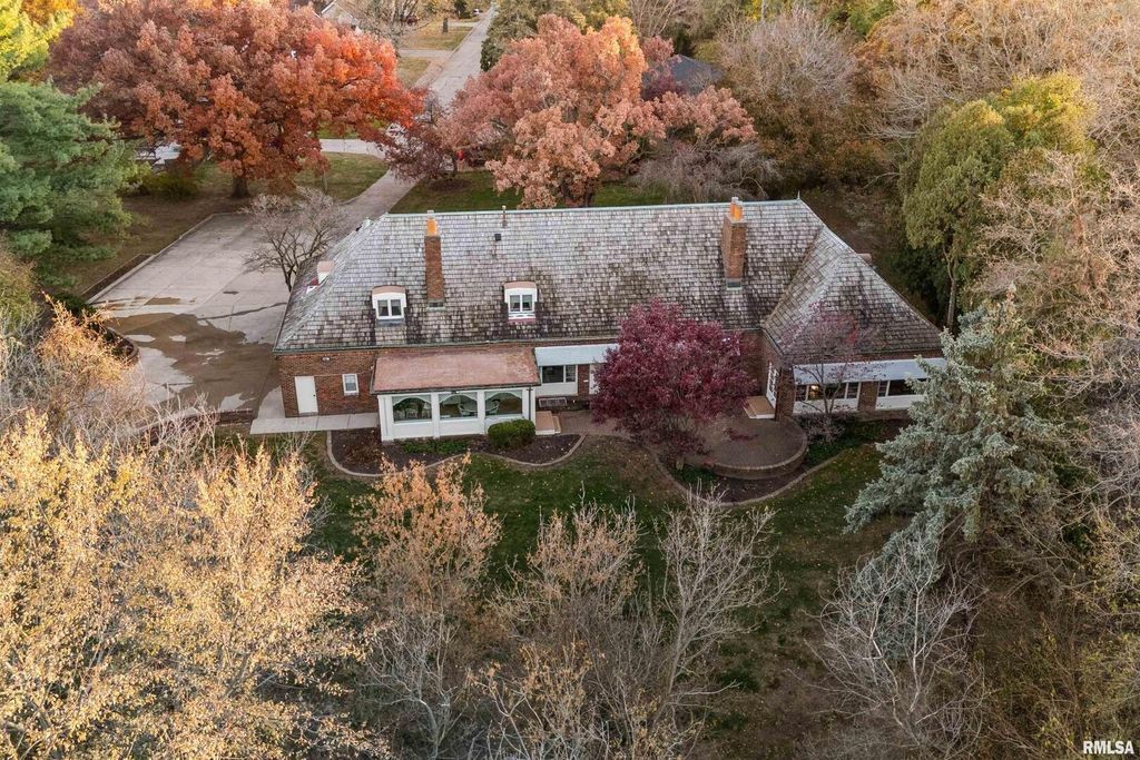 This classic brick Cape Cod Colonial ranch stands the test of time, beautifully situated on over 6 acres of mature grounds off a dead-end cul-de-sac in Moline, IL. You will feel like a royal stepping into a formal entry, which leads to a fabulous, expansive floor plan highlighted by large, gracious rooms, perfect for entertaining or family life. The spacious kitchen, featuring maple cabinets, connects to a large laundry/pantry area with stairway to second floor providing access to an in-law suite along with expansive attic storage. The first-floor primary suite is a true retreat, offering an abundant-sized ensuite with its own attached sitting area that could double as an office or extra bedroom. Walk-in closet with built-in drawers and it's own extra closet. Living spaces throughout the home feature generous crown molding, large windows, and stunning chandeliers. A bright three-season room boasts classic features, evoking a Boca Raton feel, just step outside to the patio and enjoy a secluded wooded expanse with old growth trees and abundant wildlife. The intimate, wood-paneled library provides ample built-in shelving, plentiful nooks for storage, and a dedicated card room. You'd almost expect to see the Rat Pack mixing martinis at the classic closeted bar. Timeless and stately, this is a home that evokes comfort and elegance for living today and into the future.
