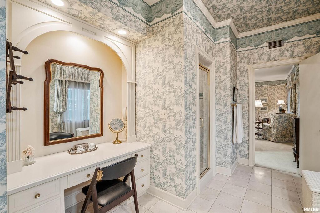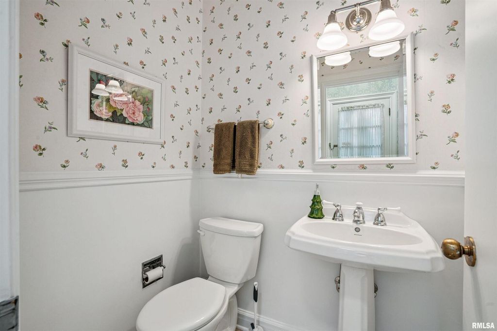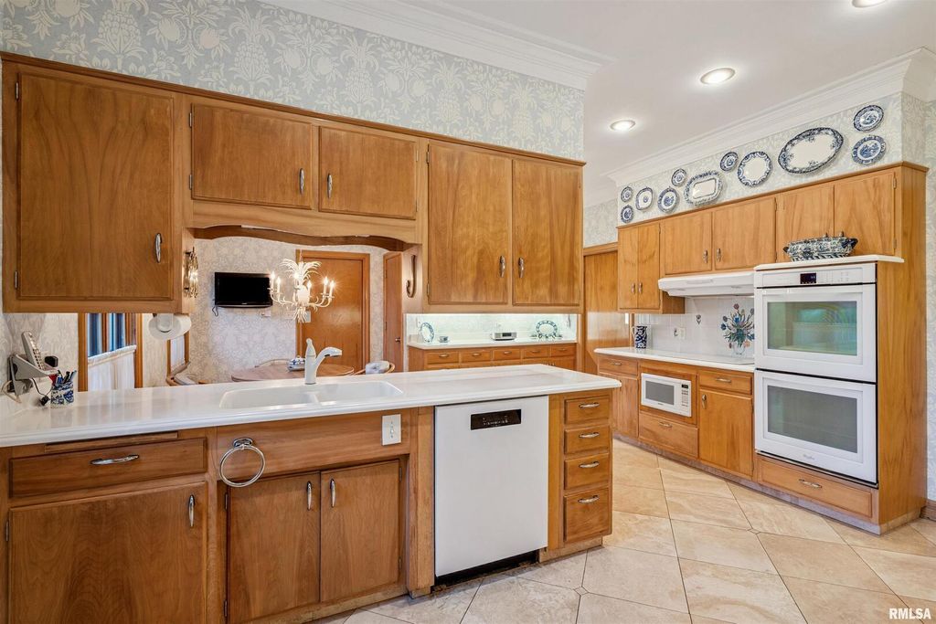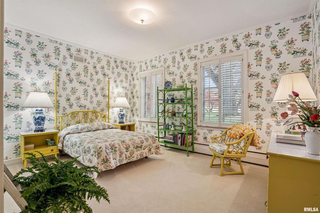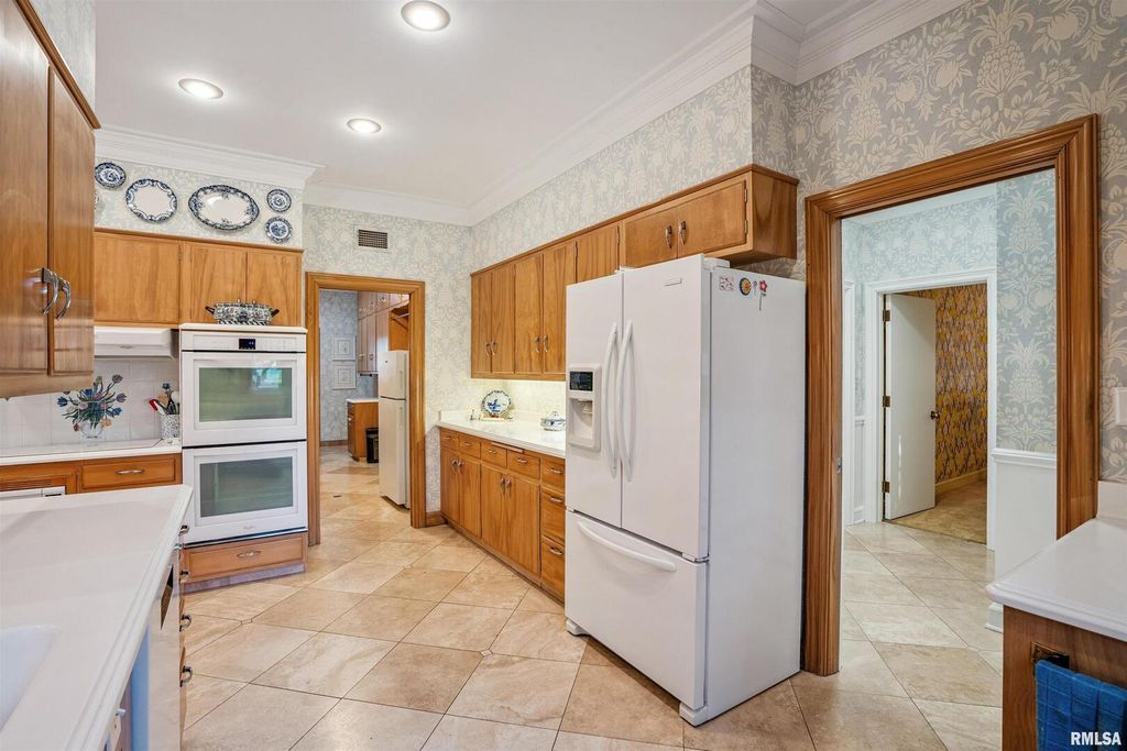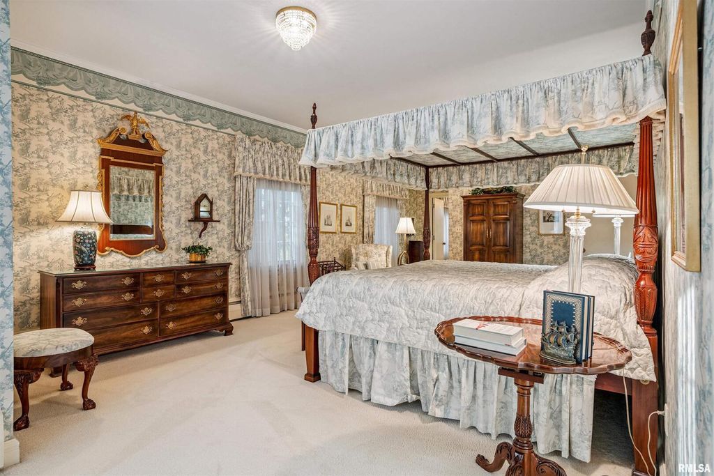 This classic brick Cape Cod Colonial ranch stands the test of time, beautifully situated on over 6 acres of mature grounds off a dead-end cul-de-sac in Moline, IL. You will feel like a royal stepping into a formal entry, which leads to a fabulous, expansive floor plan highlighted by large, gracious rooms, perfect for entertaining or family life. The spacious kitchen, featuring maple cabinets, connects to a large laundry/pantry area with stairway to second floor providing access to an in-law suite along with expansive attic storage. The first-floor primary suite is a true retreat, offering an abundant-sized ensuite with its own attached sitting area that could double as an office or extra bedroom. Walk-in closet with built-in drawers and it's own extra closet. Living spaces throughout the home feature generous crown molding, large windows, and stunning chandeliers. A bright three-season room boasts classic features, evoking a Boca Raton feel, just step outside to the patio and enjoy a secluded wooded expanse with old growth trees and abundant wildlife. The intimate, wood-paneled library provides ample built-in shelving, plentiful nooks for storage, and a dedicated card room. You'd almost expect to see the Rat Pack mixing martinis at the classic closeted bar. Timeless and stately, this is a home that evokes comfort and elegance for living today and into the future.