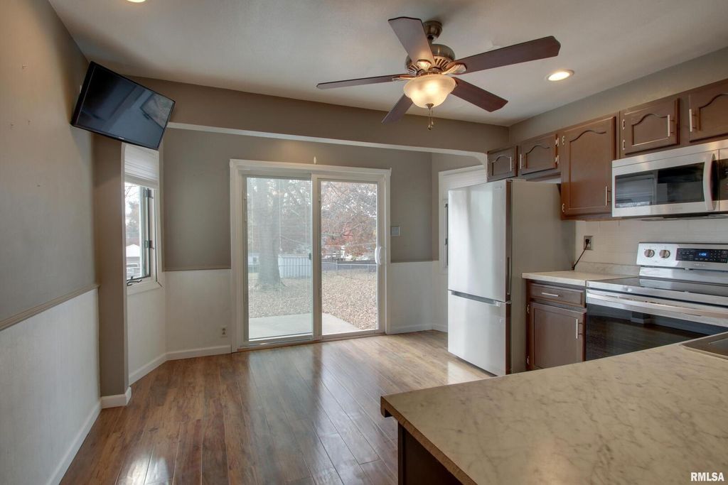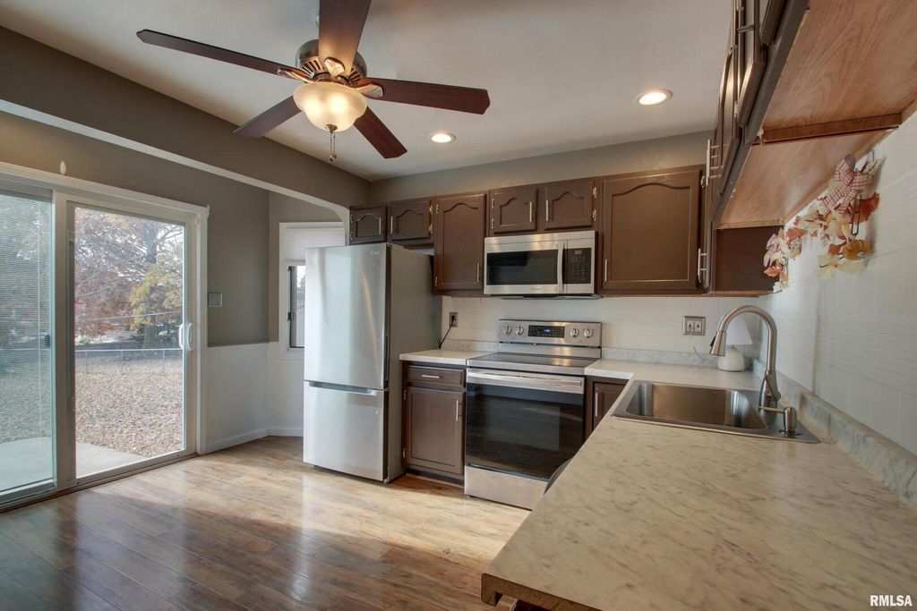 Central Location, Central Living: Your Hampshire Street Home Awaits!! Step inside this charming ranch home, perfectly situated in the heart of Quincy close to schools and shopping! You'll be greetede by stylish arched doorways, engineered hardwood floors, neutral paint tones and modern lighting. Cute kitchen includes multiple updates such as; stainless steel appliances, deep well sink, modern countertop, freshly painted cabinets and backsplash. TV with mount in kitchen conveys and has patio doors leading out to a concrete patio and fully fenced backyard. On the main level you'll also find three bedrooms; one with double closets and darling chandelier, one with trendy shiplap accent wall and one with wall-mounted TV that conveys. The remodeled full bath features a new sink, vanity, light, toilet and tub surround. Full basement offers even more living space, including a family room and recreation room with countertop, perfect for hobbies and crafts. The washer and dryer convey in the L-shaped laundry/utility room. Complete with a 1-car attached garage, this home has it all!