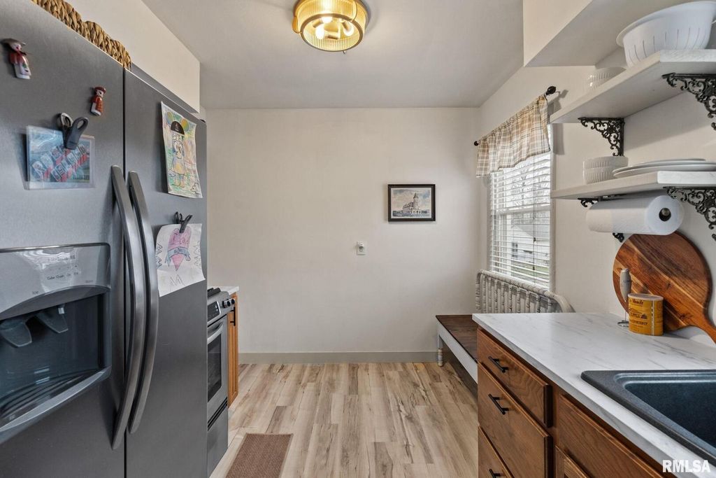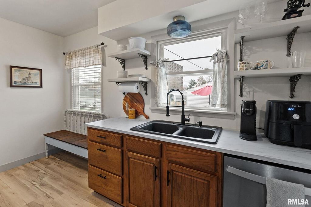 Beautifully updated 2-bedroom, 1-bath home offering 714 sq ft on the main level with a clean unfinished basement and numerous modern upgrades. This move-in-ready property features all-new vinyl plank flooring (2025), fresh interior paint, new light fixtures, upgraded outlets and switches, a fully remodeled kitchen (2024) with stainless steel appliances, and a completely remodeled bathroom (2024). Additional interior highlights include custom built-ins in the hallway and living room, with a mantle sized for a 70" TV. The home includes a washer and dryer, a partially fenced backyard with a shed and deck, a one-car garage plus metal carport, and updated essentials including a 2018 roof, 2019 electrical panel, and 2019 central A/C. Smart home features-Google Nest thermostat, Nest doorbell, four exterior Nest cameras, and Yale smart locks-can stay with the home. City improvements include new front sidewalk concrete in progress and a scheduled full water meter replacement in November 2025. Radon test from 2021 came back clean. A truly charming, well-maintained home with modern comfort throughout.